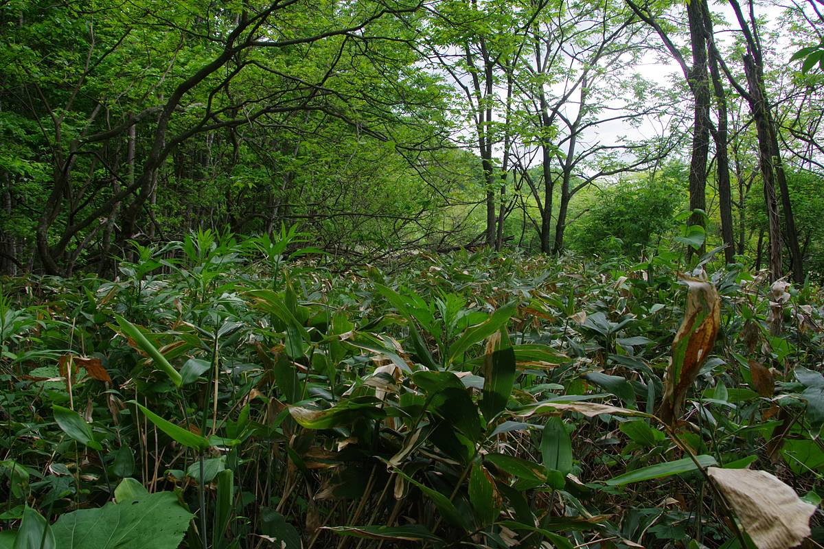 笹メインの密生藪が臍から胸くらいの高さまで生い茂っており、これは“強烈な藪”と言って差し支えないと思うが、笹の稈(茎)がやや細いために全体が柔らかく、身体を絡め取るほどは硬くないことに救われた。同じ丈のススキの藪と同じくらいの抵抗感で踏越えることができる感じだった。