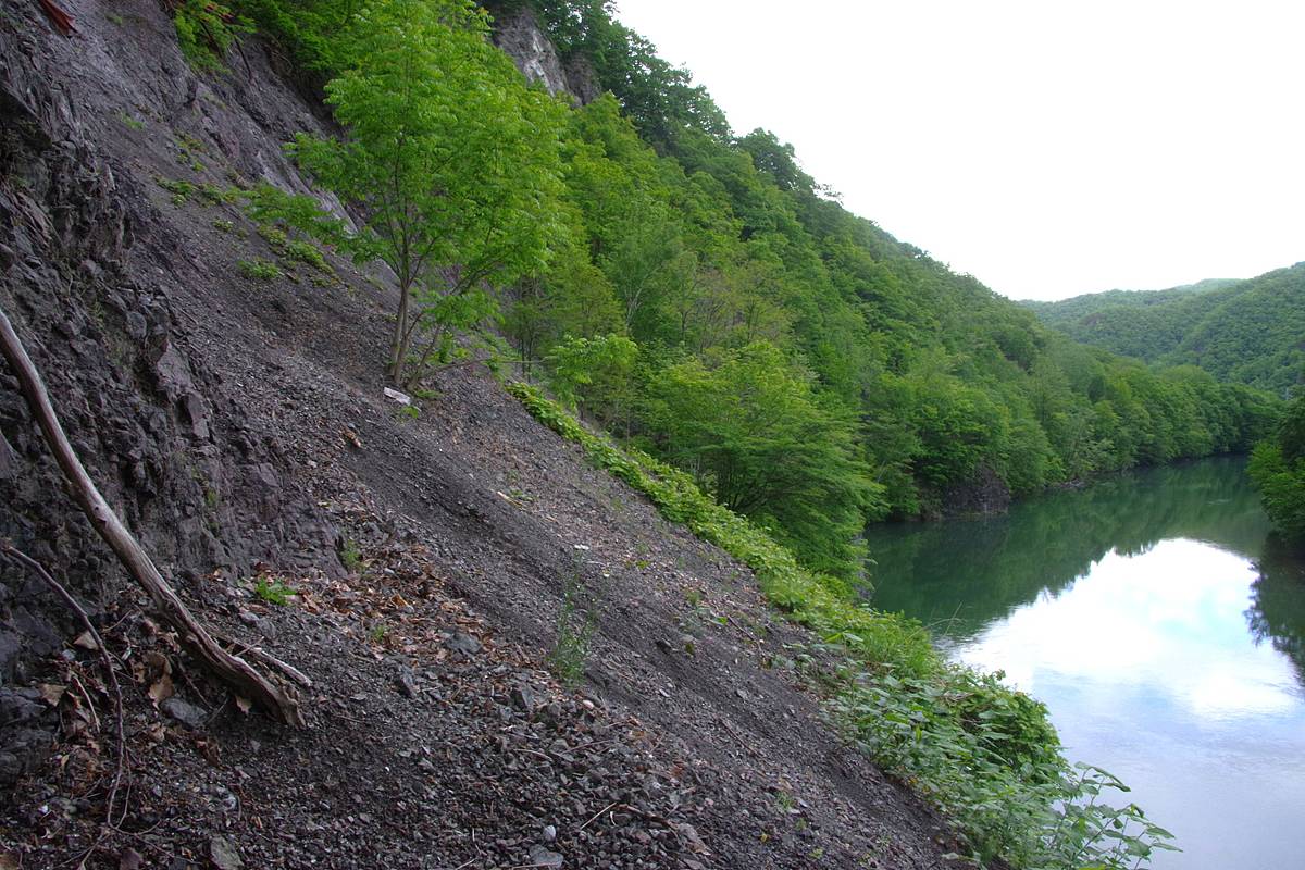川の曲がりの外縁側、ちょうど流れの衝にぶつかる岸が厳しく浸蝕されて急峻な崖地になるという、全くセオリー通りの険悪さだ。