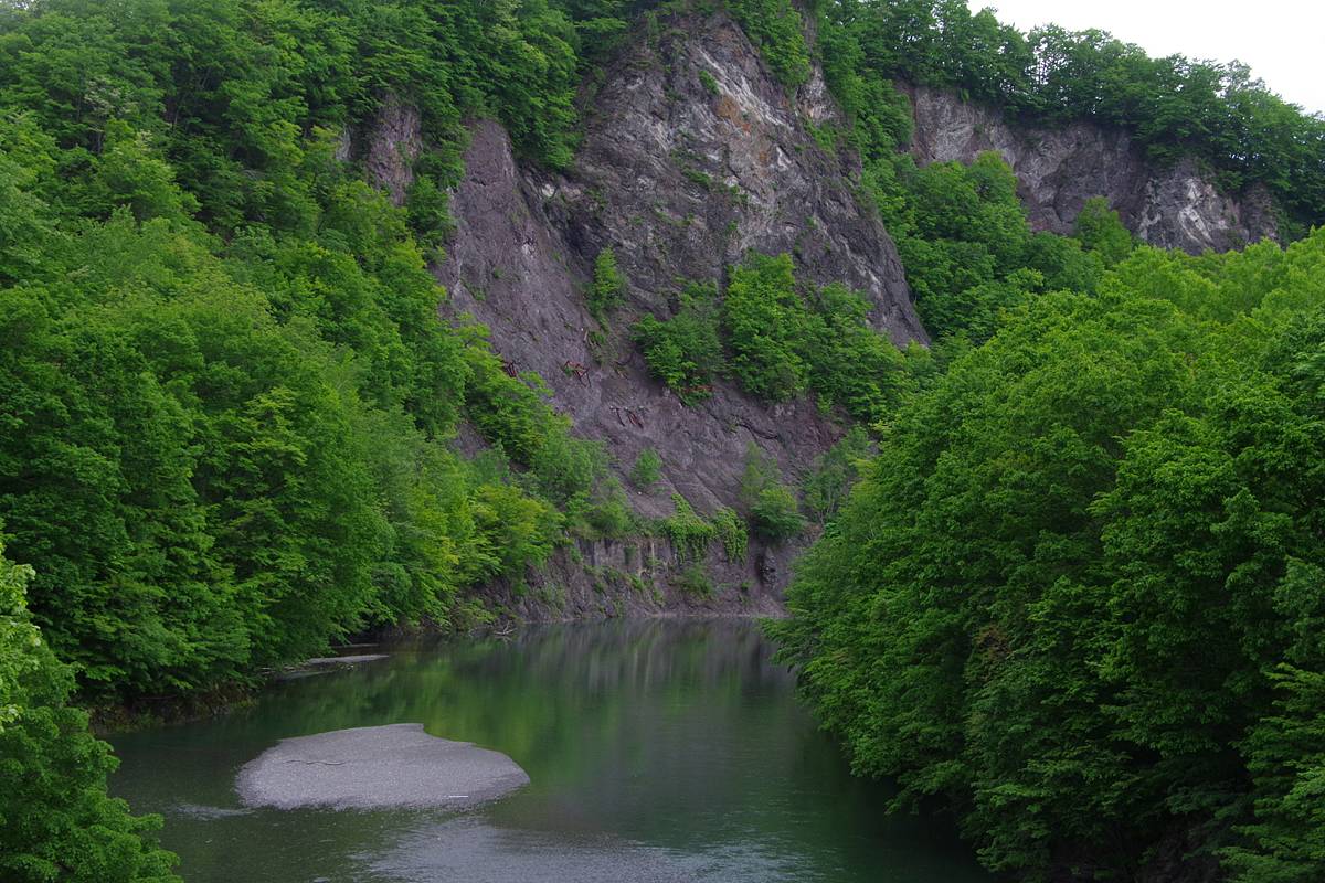 周りの緑を溶かし込んだような色の深い水が湖面のように静止しているが、800m下流に山部頭首工という取水堰があるためだ。