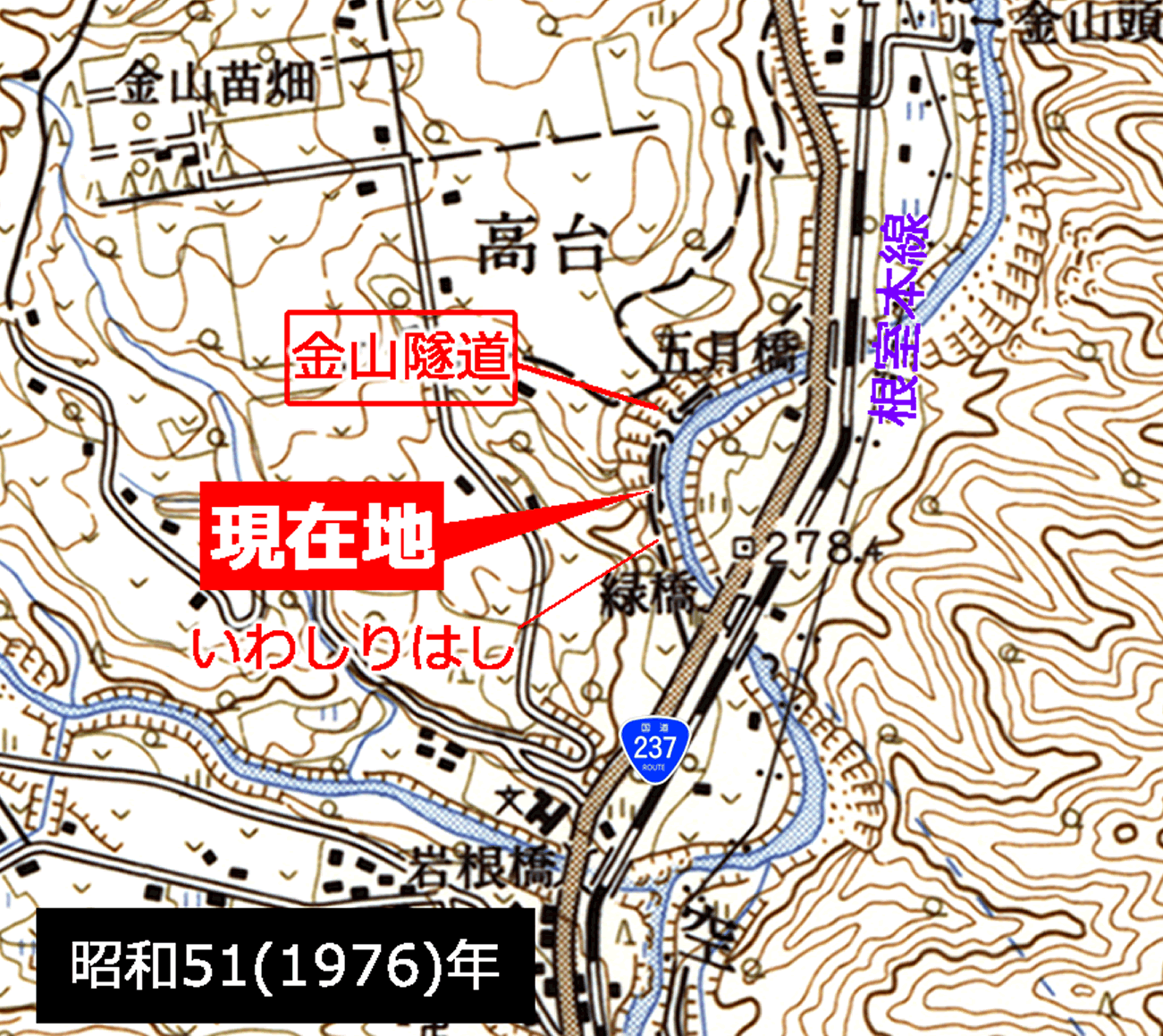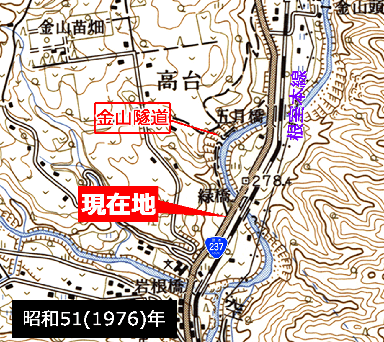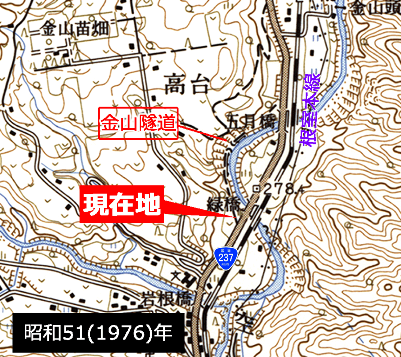 注目! Aと比べると、線路が一部付け替えられているのが分かる。そして付け替えられた旧線の跡地がそのまま国道237号の経路に組み込まれている。 鉄道時代は描かれていなかったトンネルが現われているが、実際は鉄道時代から存在していた、これが「金山隧道」である。