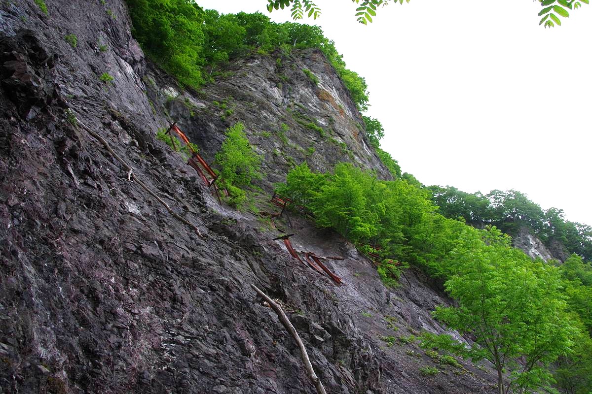 道があった場所は全て崖錐斜面になっているが、その上部はご覧のように恐ろしく切り立った露岩である。