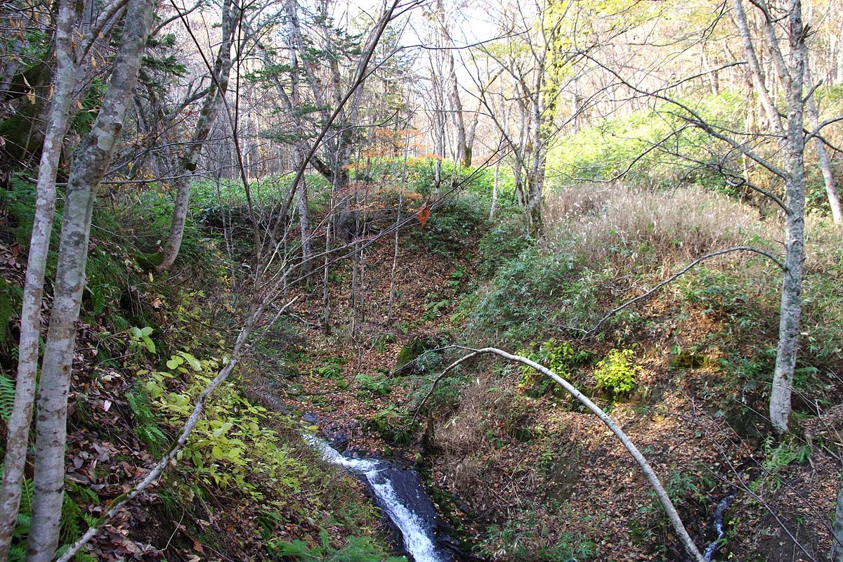 スプリコヤンベツ川を渡った旧道は、九十九折りで手近な尾根へ登っていく形勢を取るが、最初の切り返しがまだ来ていない。