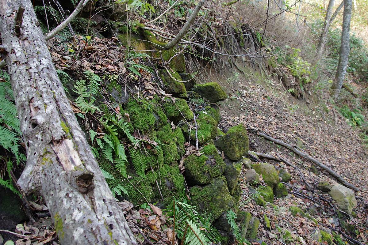 今いる道のすぐ下に、並走するより急勾配な平場の存在が認められ、これが【先ほど分れた】旧旧道、“囚人道路”の跡だろう。