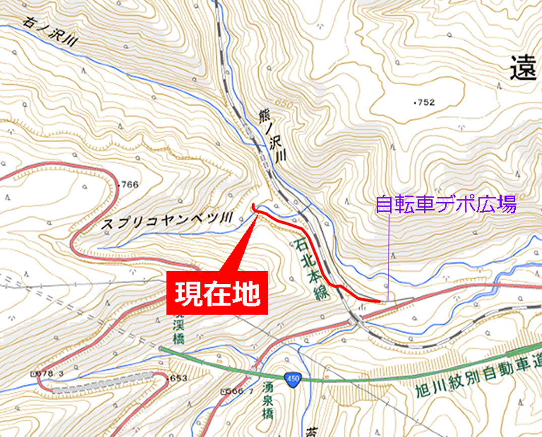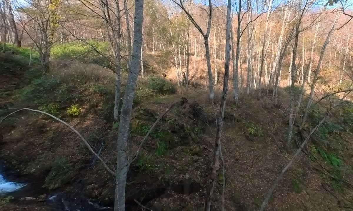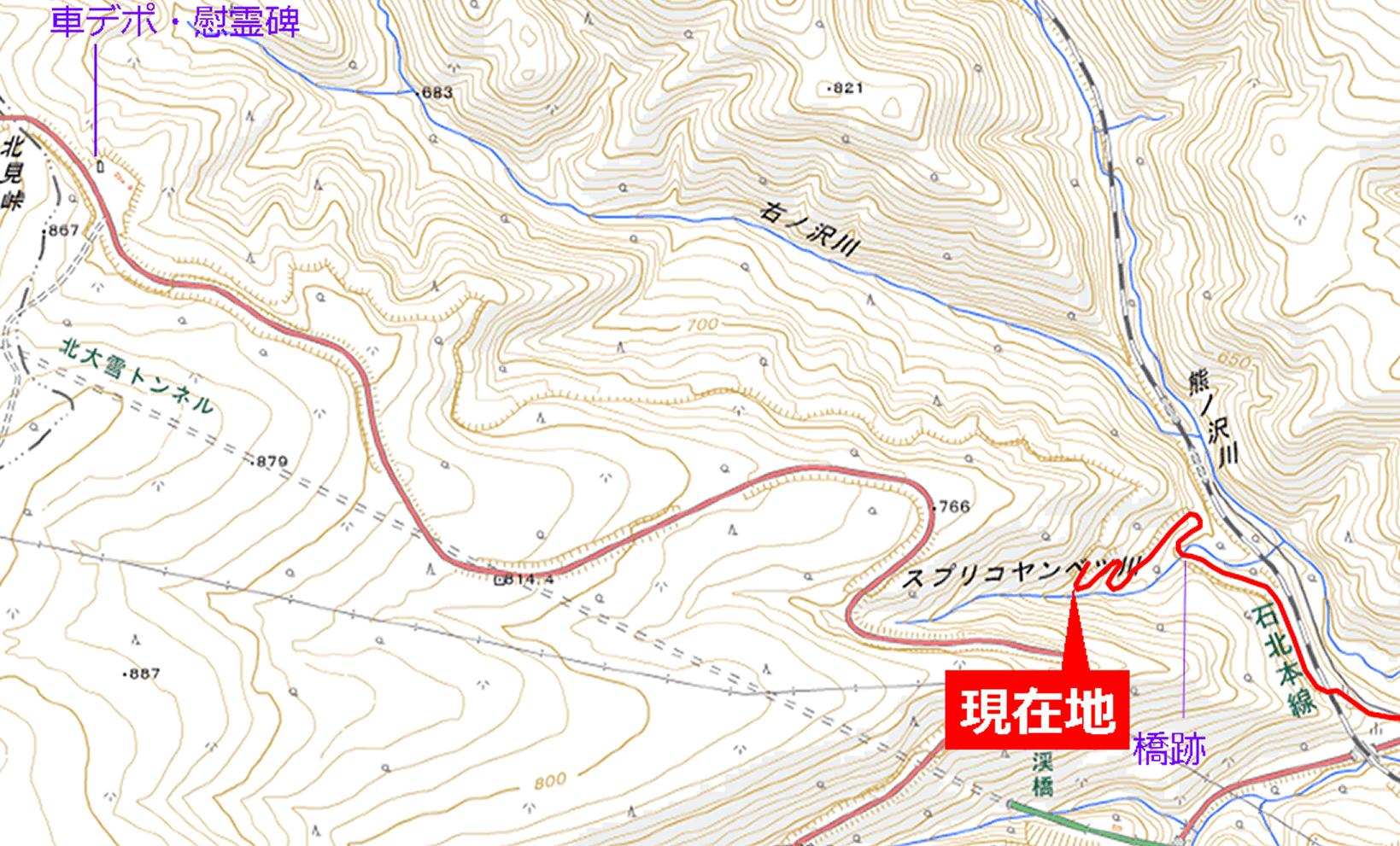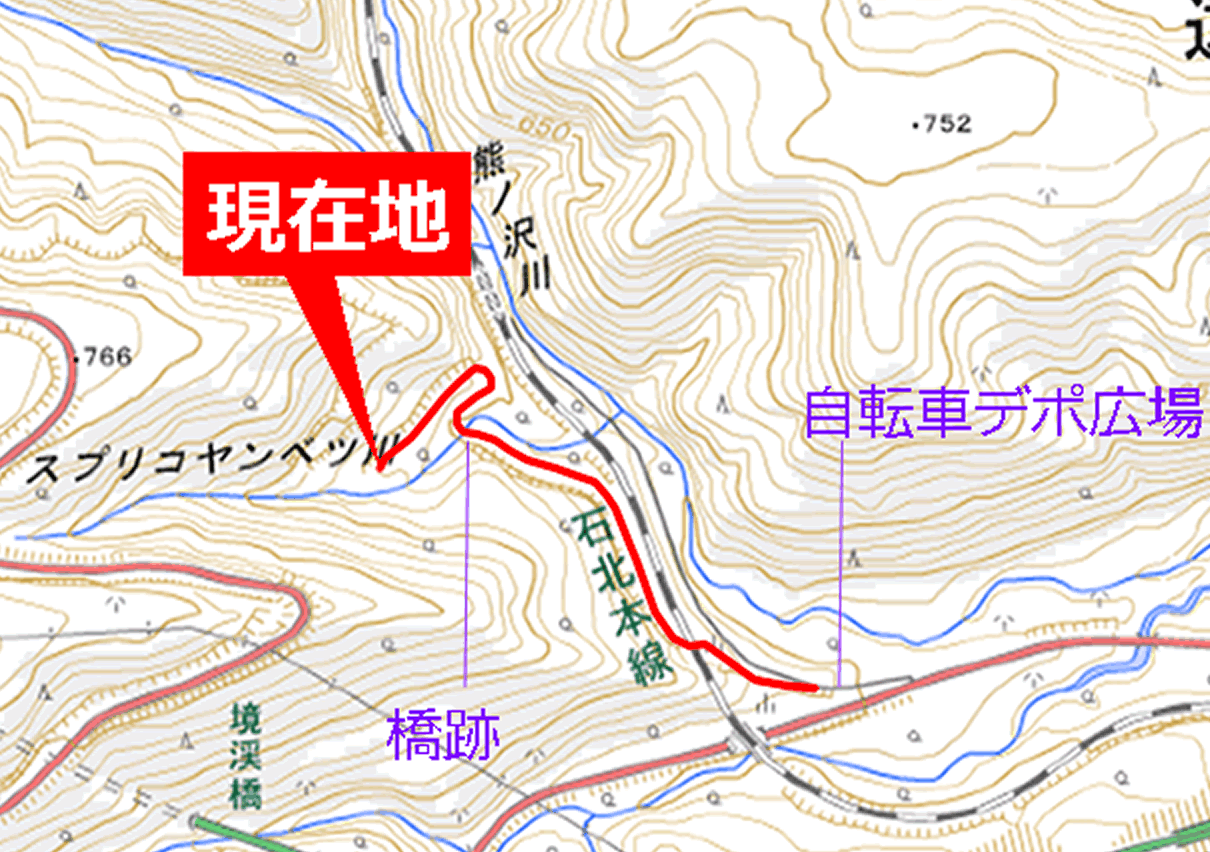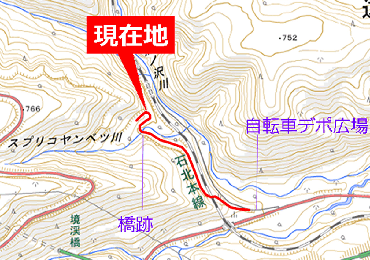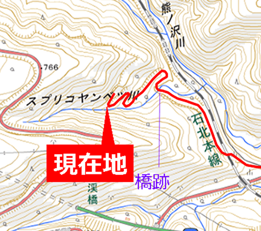 ところで、ちょっと適切な写真を撮り忘れたので、少し時間を巻き戻してスプリコヤンベツ川を渡る直前に撮影した全天球写真からの切り出しを見て貰っているが、この写真の「現在地」の位置から黄色のラインのように切り返して登っていく“旧道”に対して、これを赤い点線のようにショートカットする小さな“旧旧道”が存在したと考えている。
