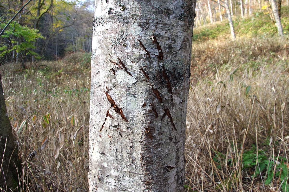 エゾシカも木の幹で角を研ぐらしいが、この鋭い傷の付き方は……。