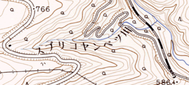 地図上に描かれた水線の長さが1kmにも満たない小谷だが、地形図にはこれより長い無数の谷を差し置いて、名前の注記がある。