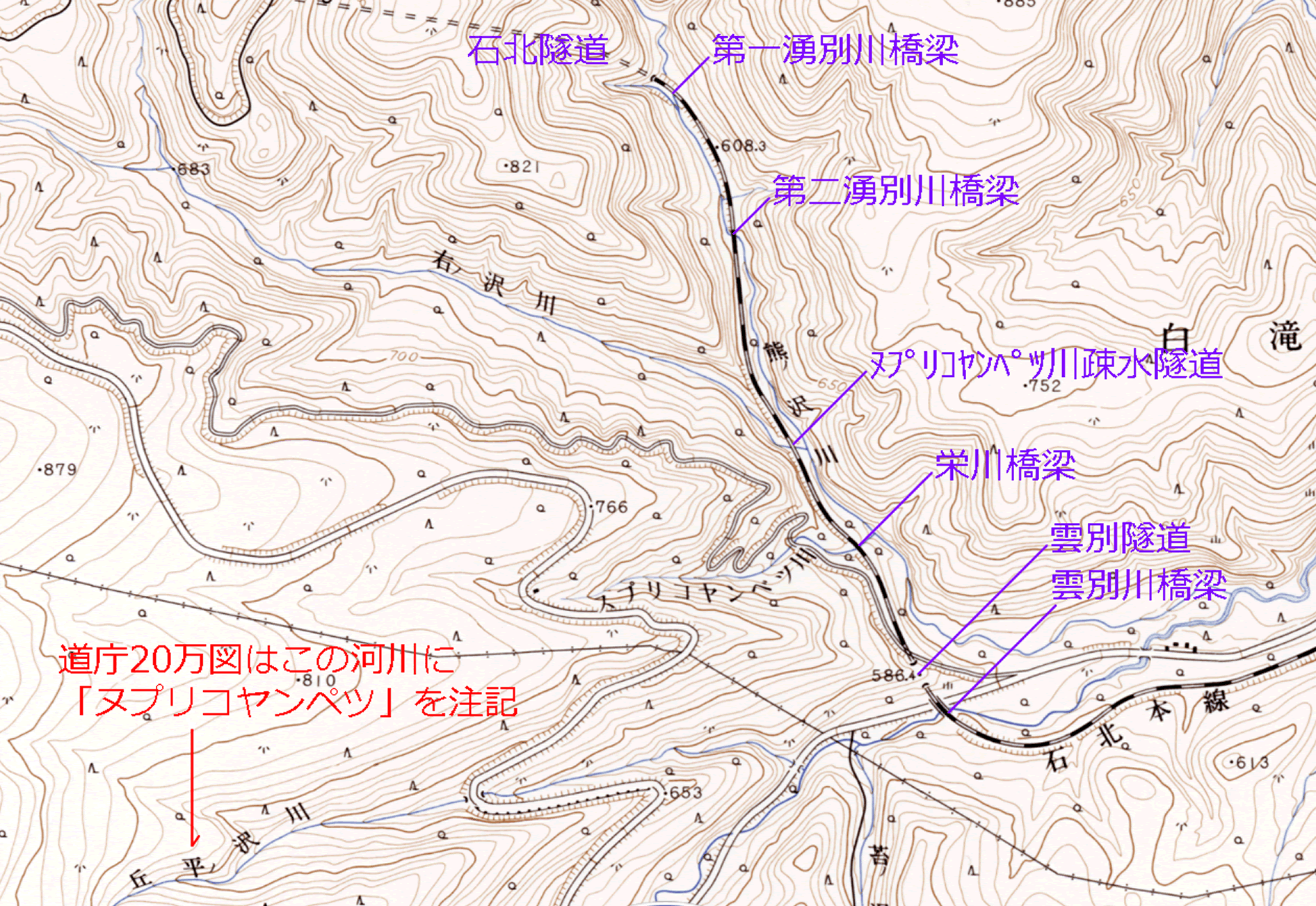 この小さな川の全体が収まる現在の5万分の1地形図の図名は「白滝」であるが、その図歴を遡ってみても、最古は(レポート本編でも引用している)大正13(1924)年版で、そこに河川名の注記がないことは確認済み。当地を描いたこれより古い5万分の1地形図は存在しない。