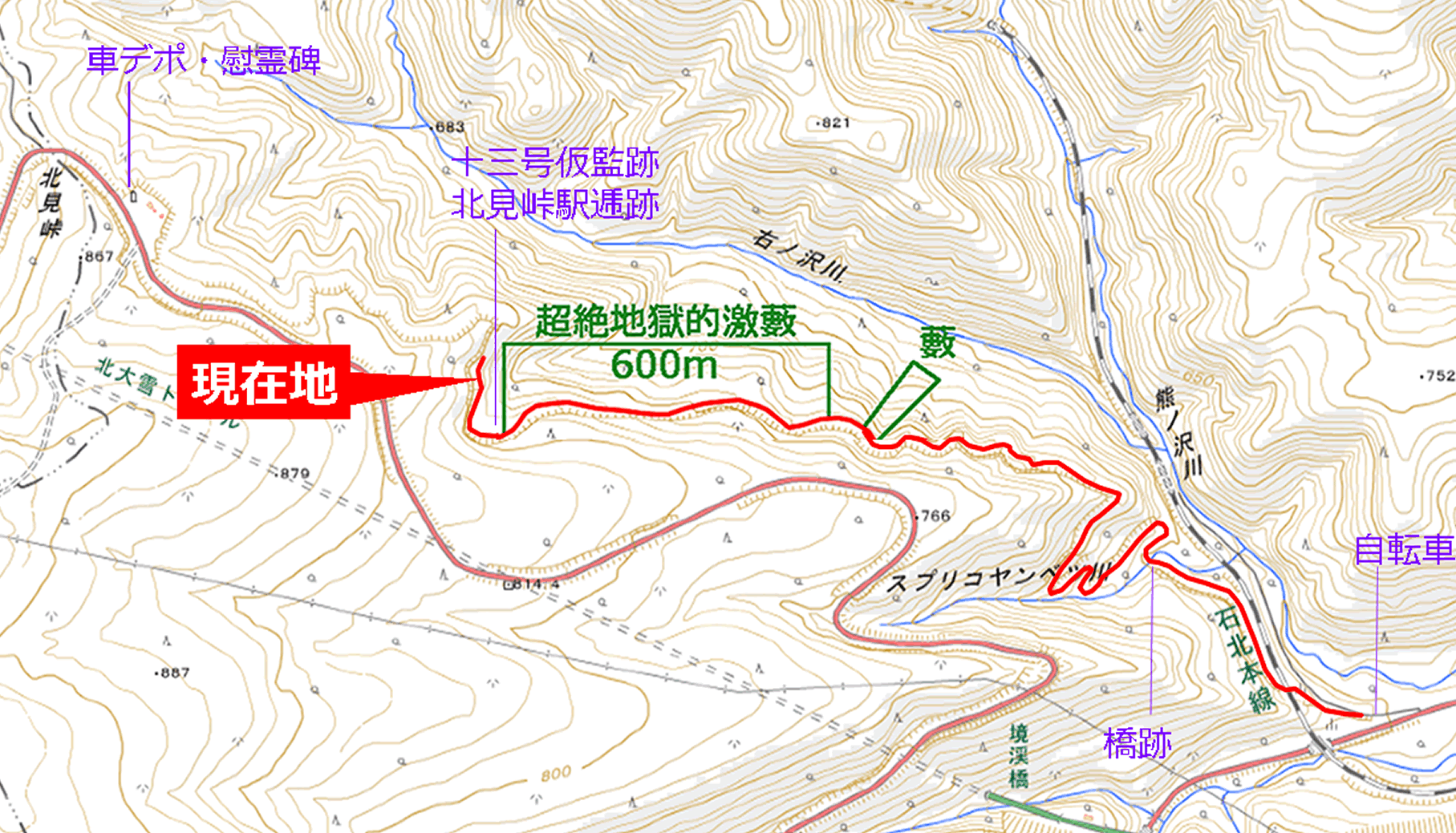 そのひろみず氏が、レポートの中で、「進みにくい笹薮を苦労して越えていった結果、そこに何かしらの遺構があるのならばまだ良い。これまでの道の残存状況やこの先の地形を考えて、おそらくそういうものに巡り合うことは無さそう。打算的で邪な考えがよぎった途端、目の前の困難に突入する気力は・・・尽きました」と書いて、踏破を断念された区間の長さも600mであったと記録されている。
