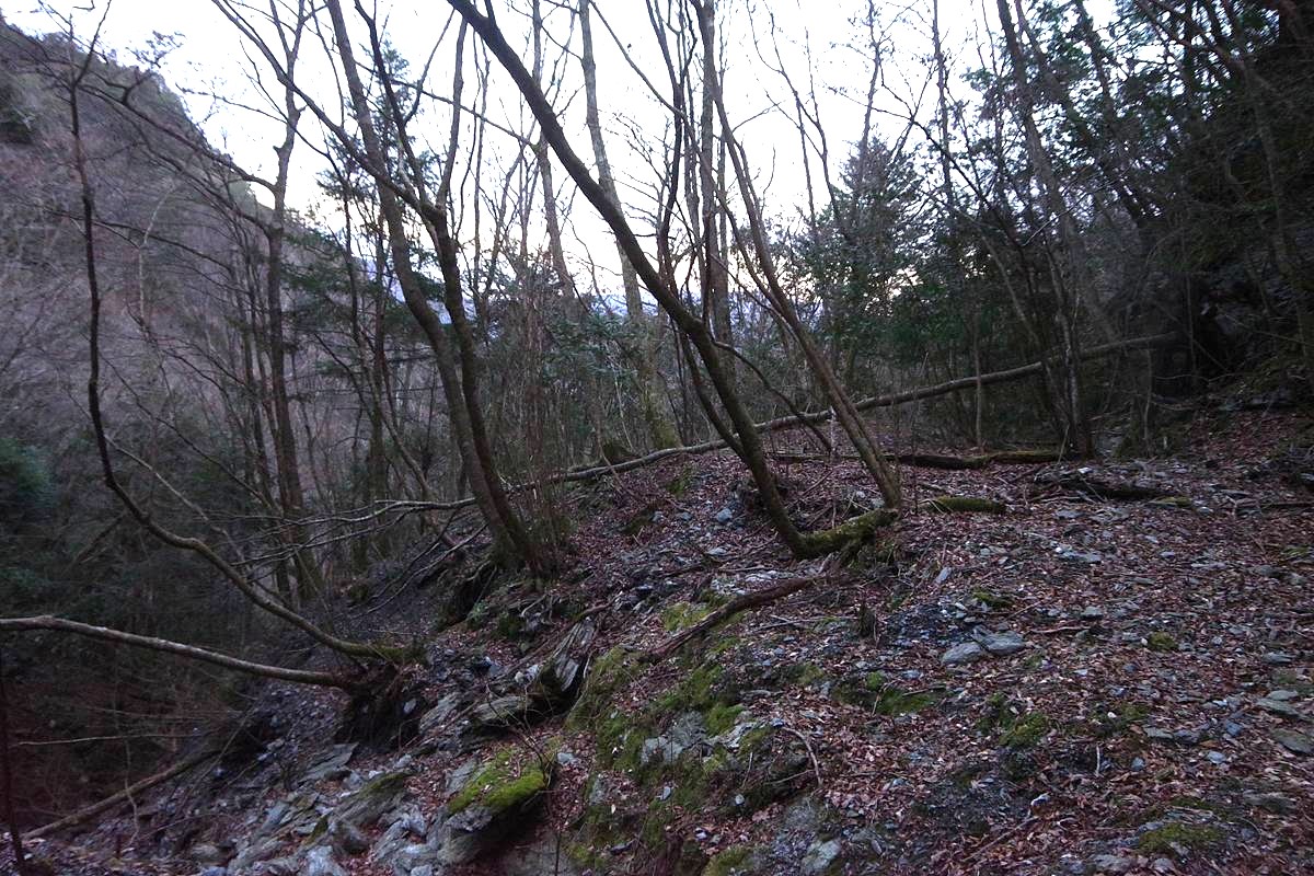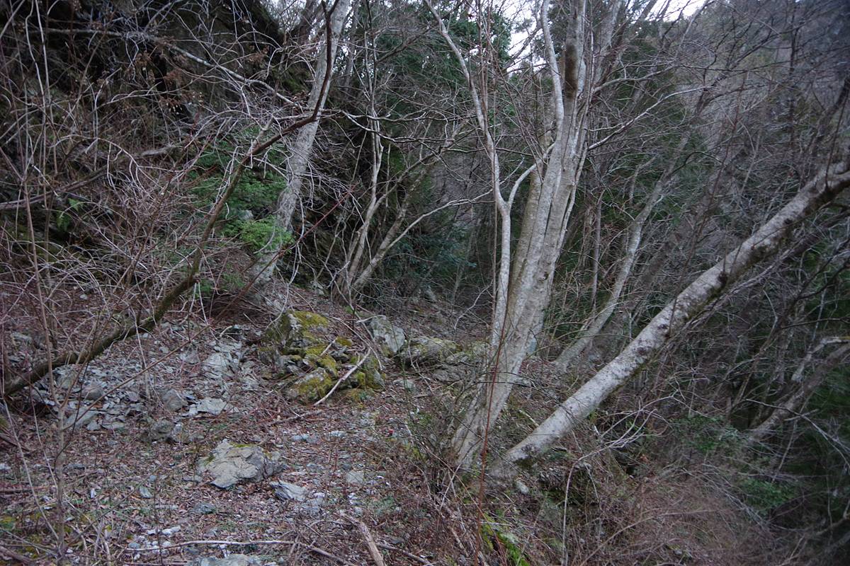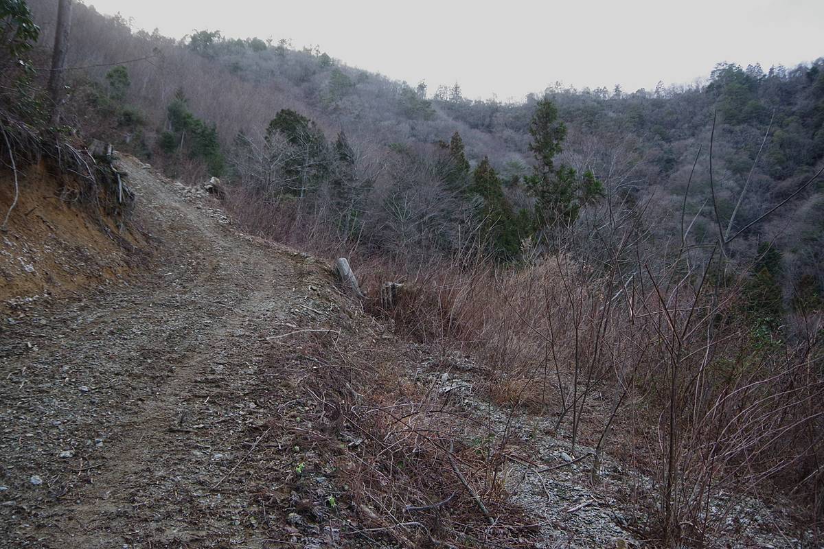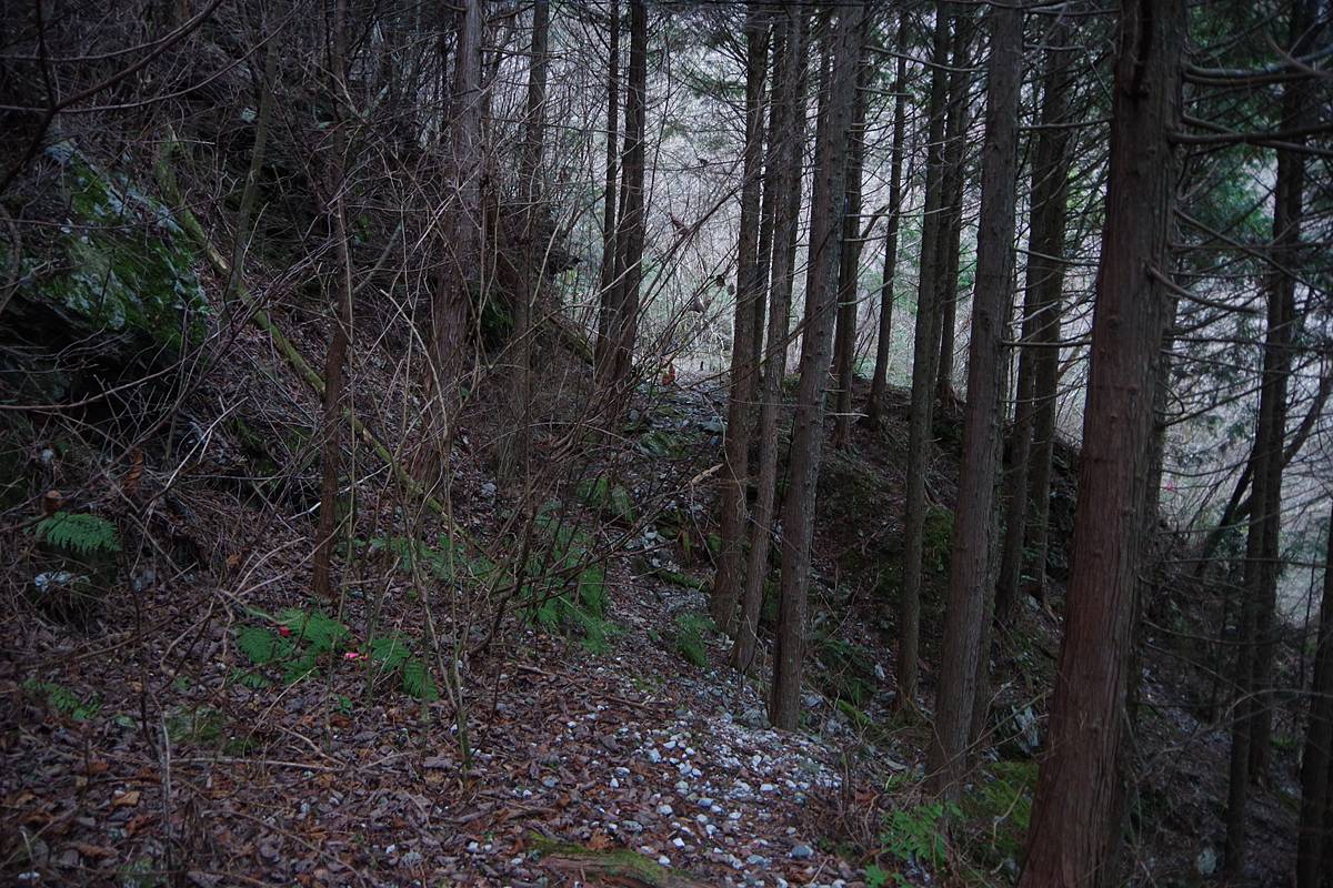 轍こそないが、明らかに道形と思しき平場が、作業道の急坂から外れて水平に続いているのを見つけた。