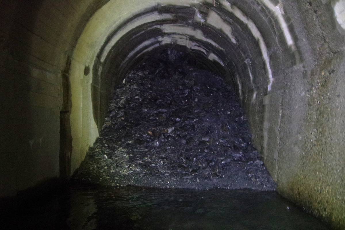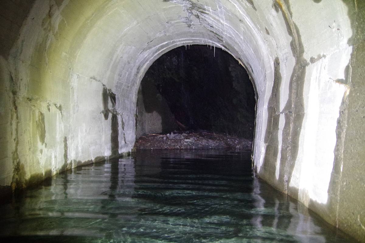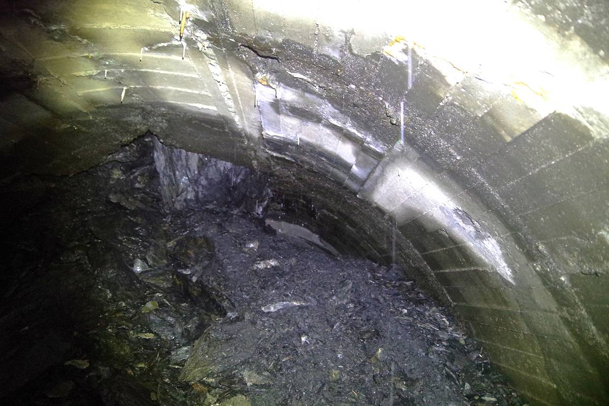 両坑口に堆積した土砂によって地下水が堰き止められ、両坑口付近が水没しているほか、洞内2ヶ所に規模の大きな落盤があり、特に西口側の落盤は通過困難な状況になっていた。