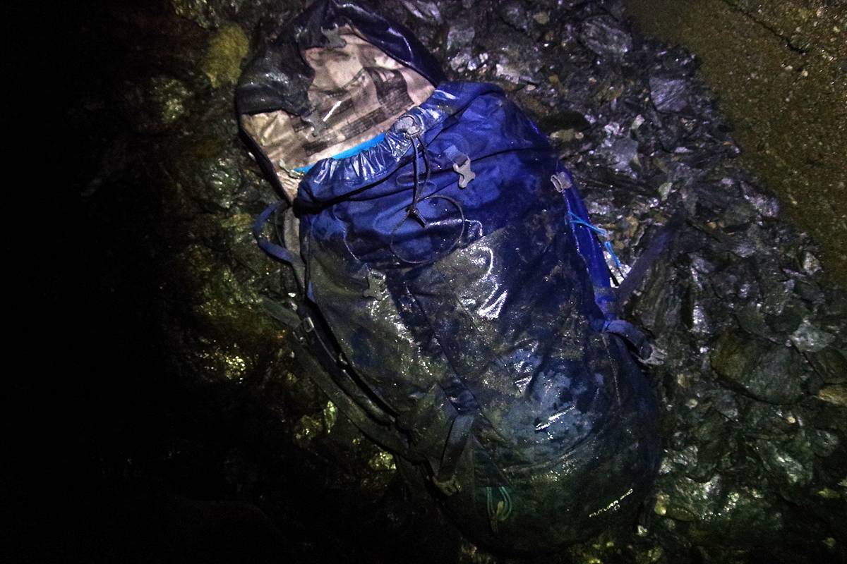 土砂降りの地下水シャワーの下に一番長く放置された結果、夕立の後みたいな濡れ方になっており、ここへ来る前に既に水没でぐしょ濡れだった私の下半身と、穴の通過中にぐっしょり濡れた上半身と、良いおそろいになった。(画像は遺留品のようだが…)
