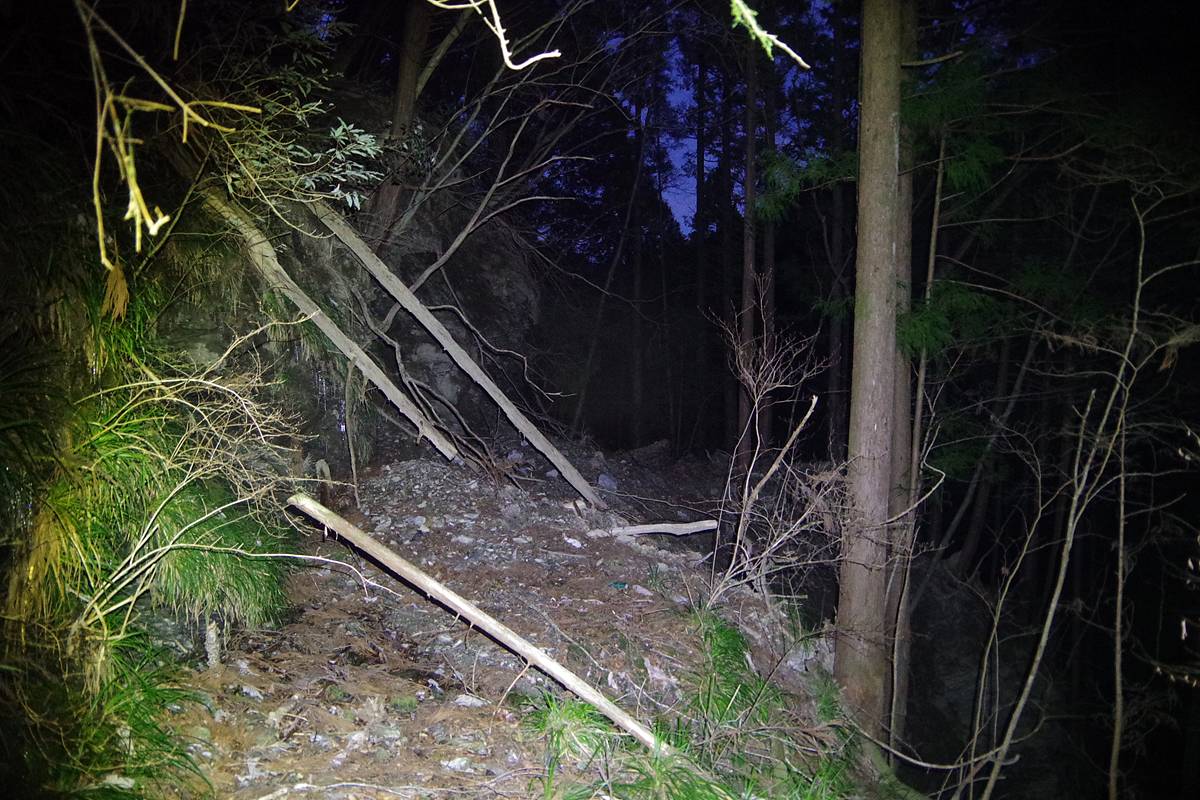 沢山の瓦礫や倒木も散らばっていて、完全に廃道の状態だ。吾北側の坑口前と同じような路面状態である。