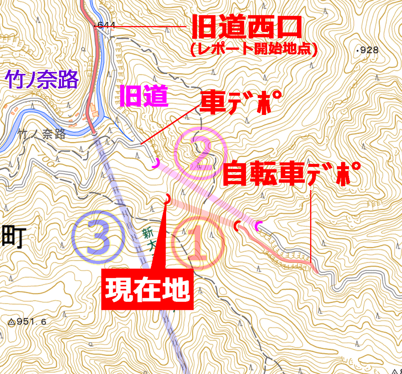 地図を見る限り、車をデポしてある地点まで直線距離で約300m、高度差がマイナスの60mくらいである。かなり近いが、さすがに道を無視して行くのは危険だろう。