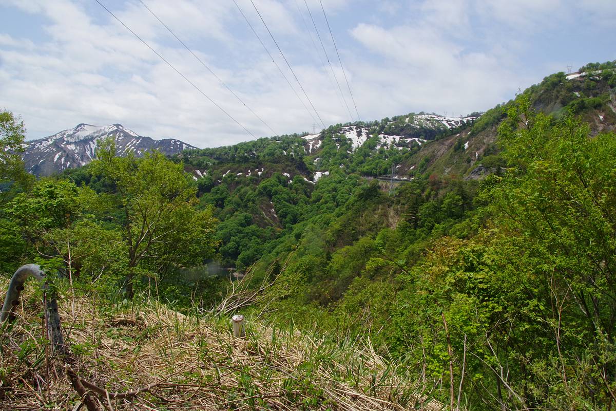 見渡せる峠方向には、うねうねと青い山肌を回り込んで伸びる現道や、壮大な送電線の連なりを、爽快に見渡せる。