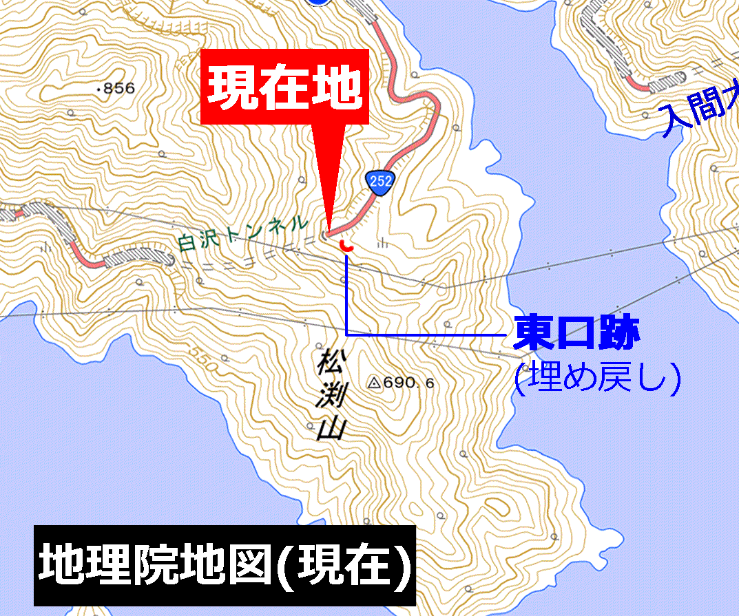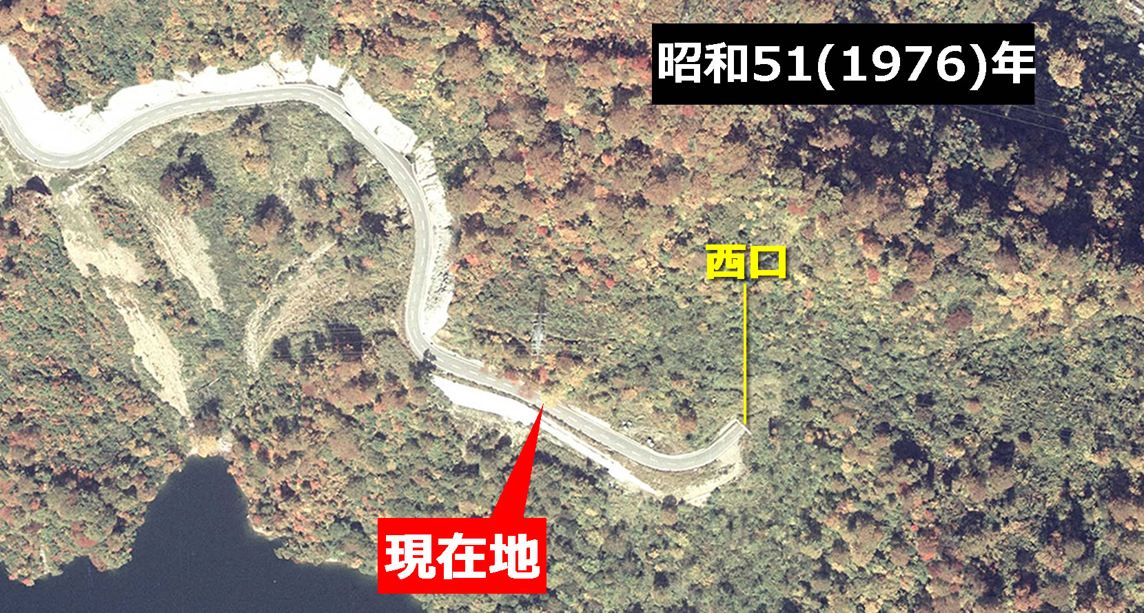 現トンネルの坑口を守るコンクリートブロックの擁壁が、旧道の道幅の大半のうえに建築されているためだ。