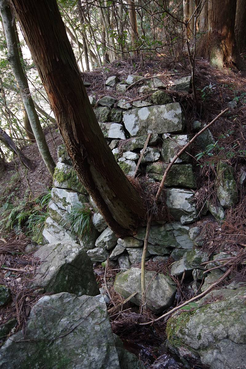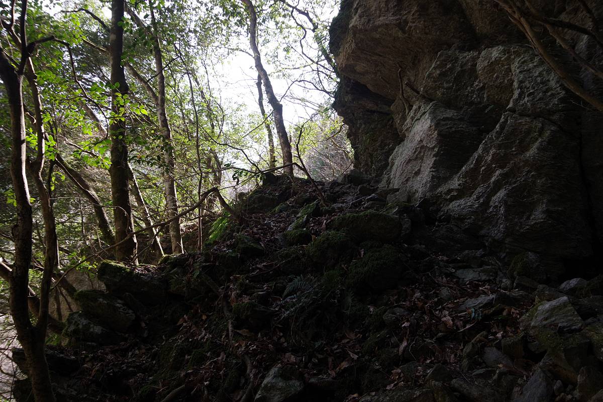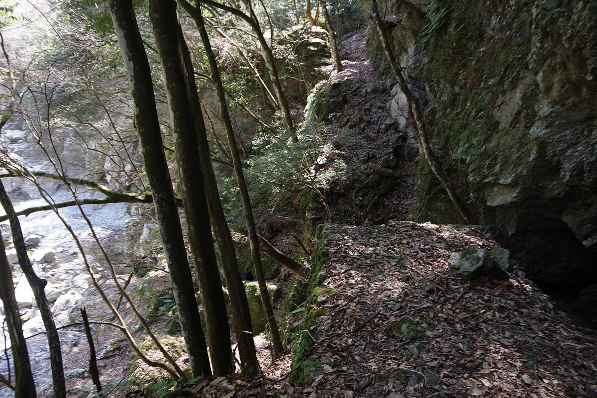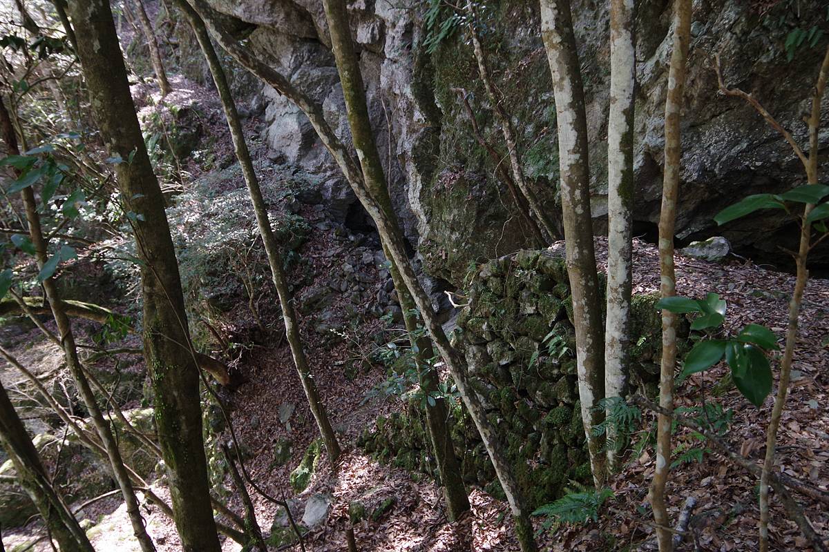 この路盤の“断絶”は、高い岩壁に寄り添うように設置された大きな石垣が、おそらくは過去の水害の影響などで流失した結果であろうと推定される。