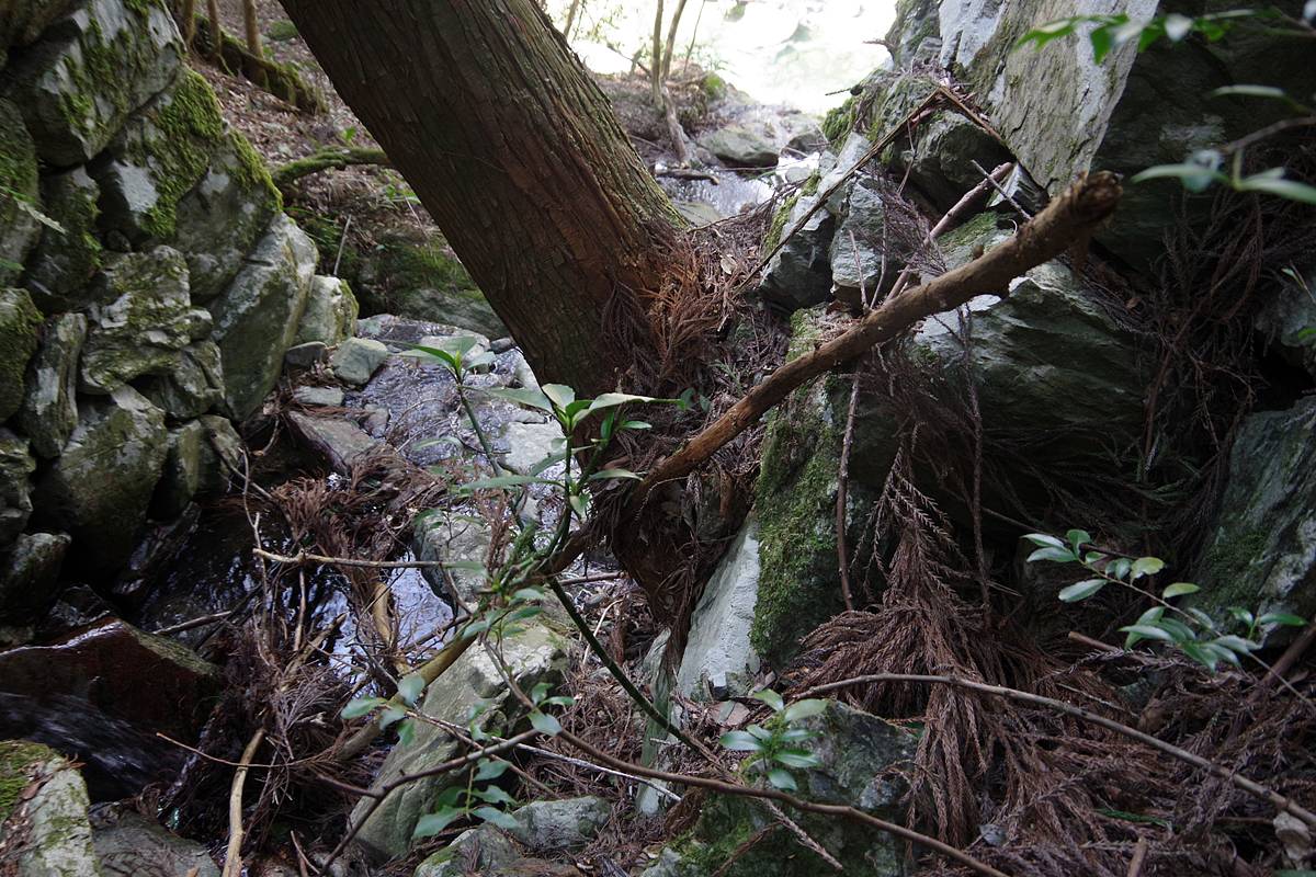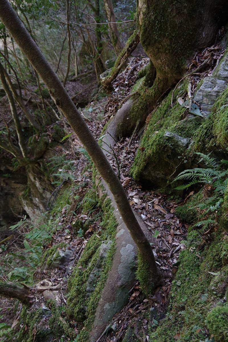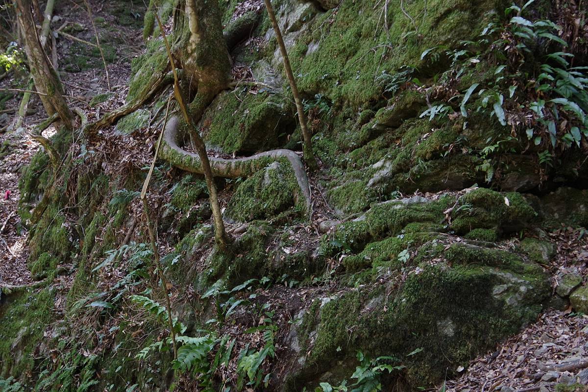 太い根に足を乗せ、上半身は苔生した崖を掴みながら、カニ歩きのようにこの高い岩場を横断して、先へ進んだ。
