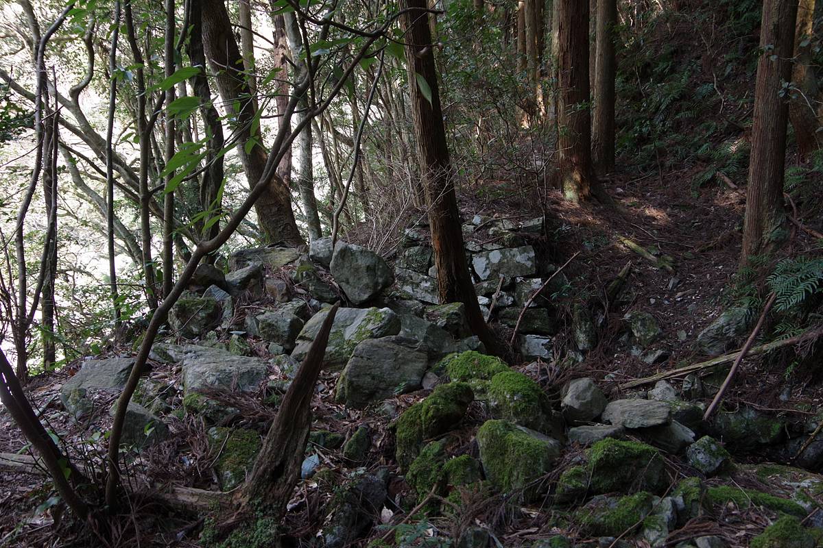 チェンジ後の画像も、この広い平場(広場)で撮影したものだが、広場全体が同じ高さではなく、山側に低い石垣で区別される一段高い平場があり、そこが軌道跡であるようだった。