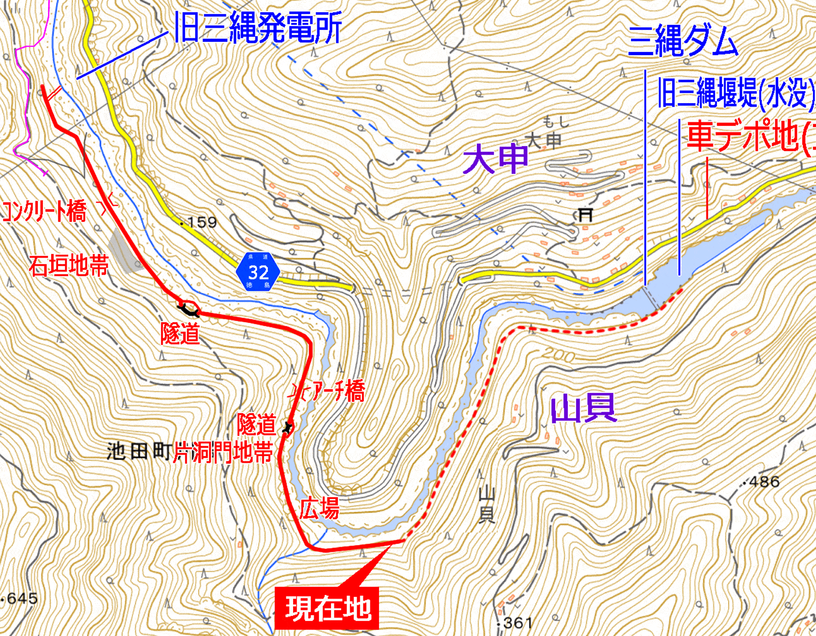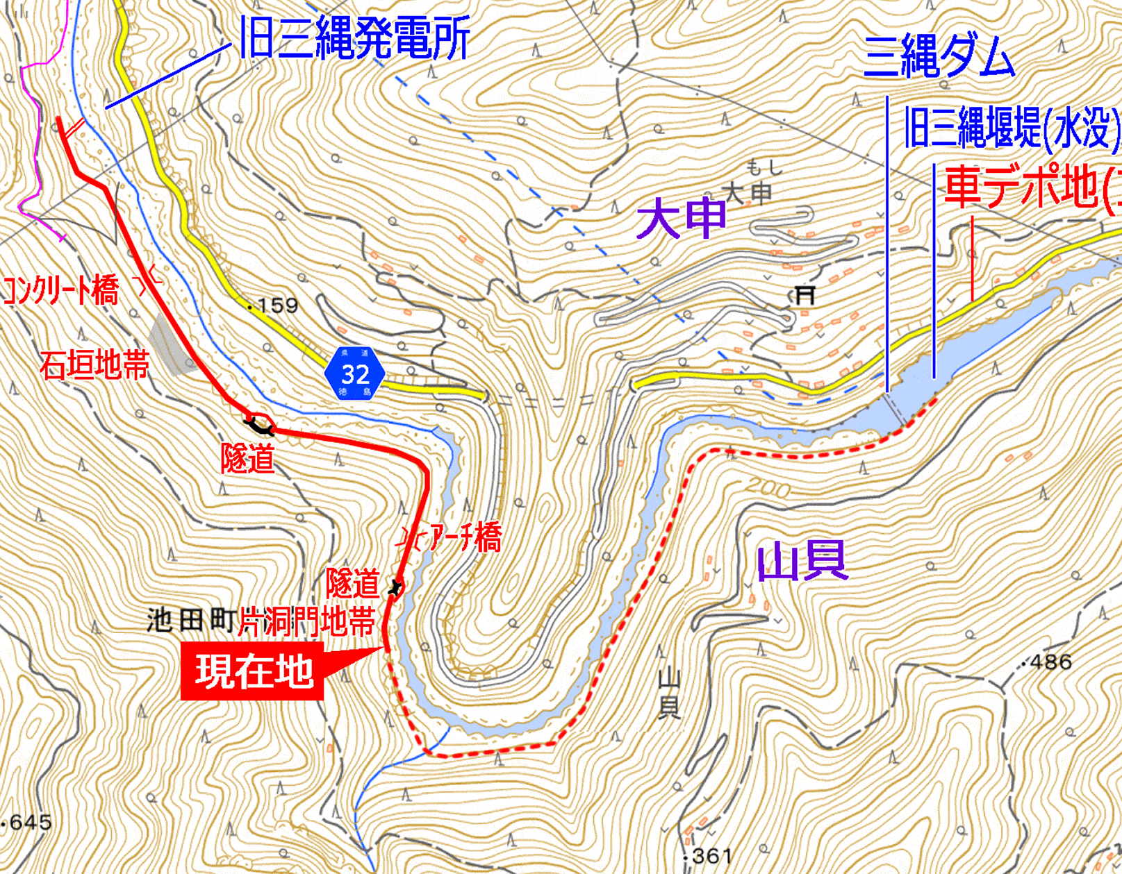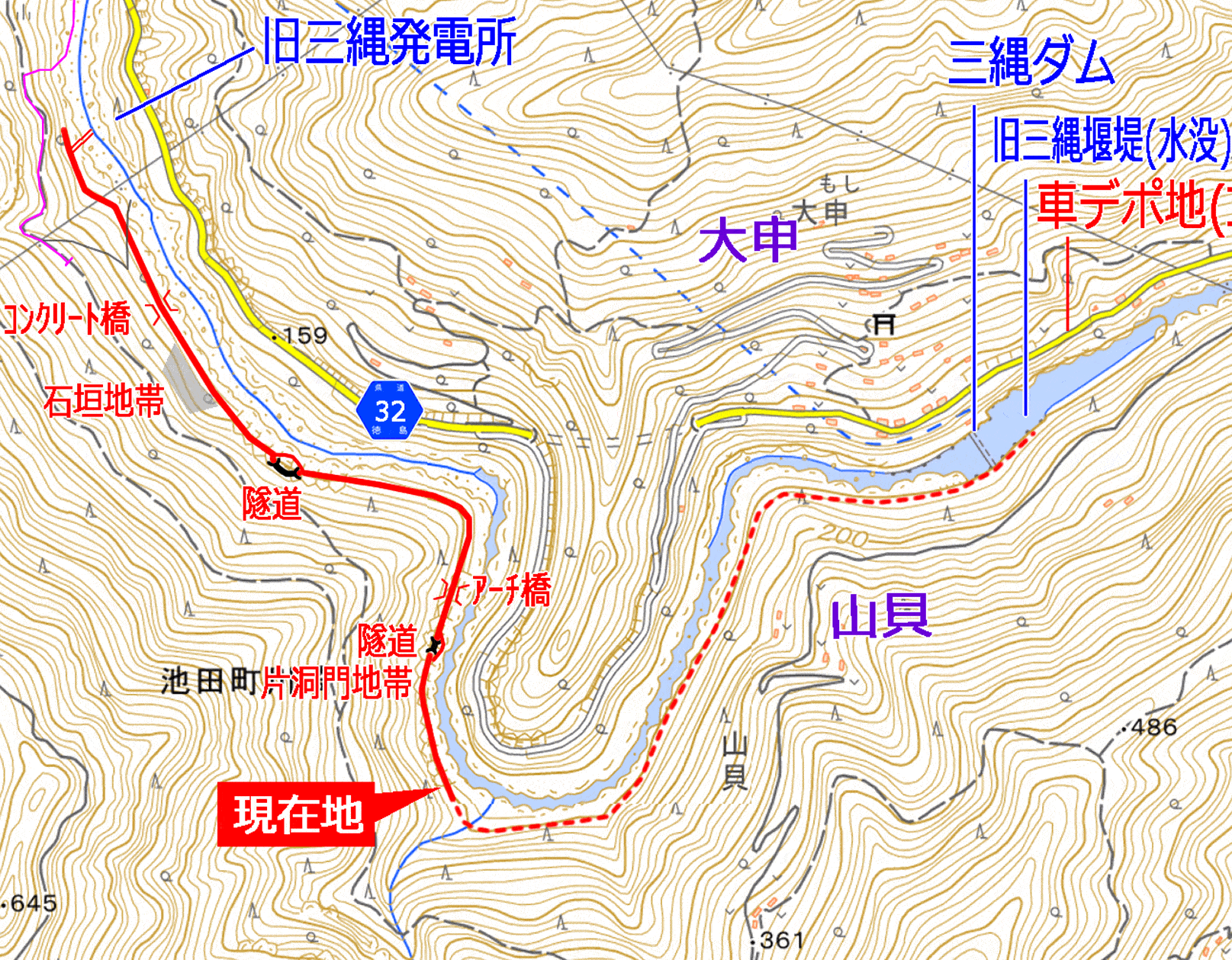 現在地点は、旧三縄発電所対岸にある軌道跡の下流側末端から約1.4km前進した地点で、想定される全長に対して6割程度を終えたところだ。そんなこれまでの成果は、期待を遙かに上回るものがあって、未知の現存橋梁2本と貫通隧道2本を獲得済み!
