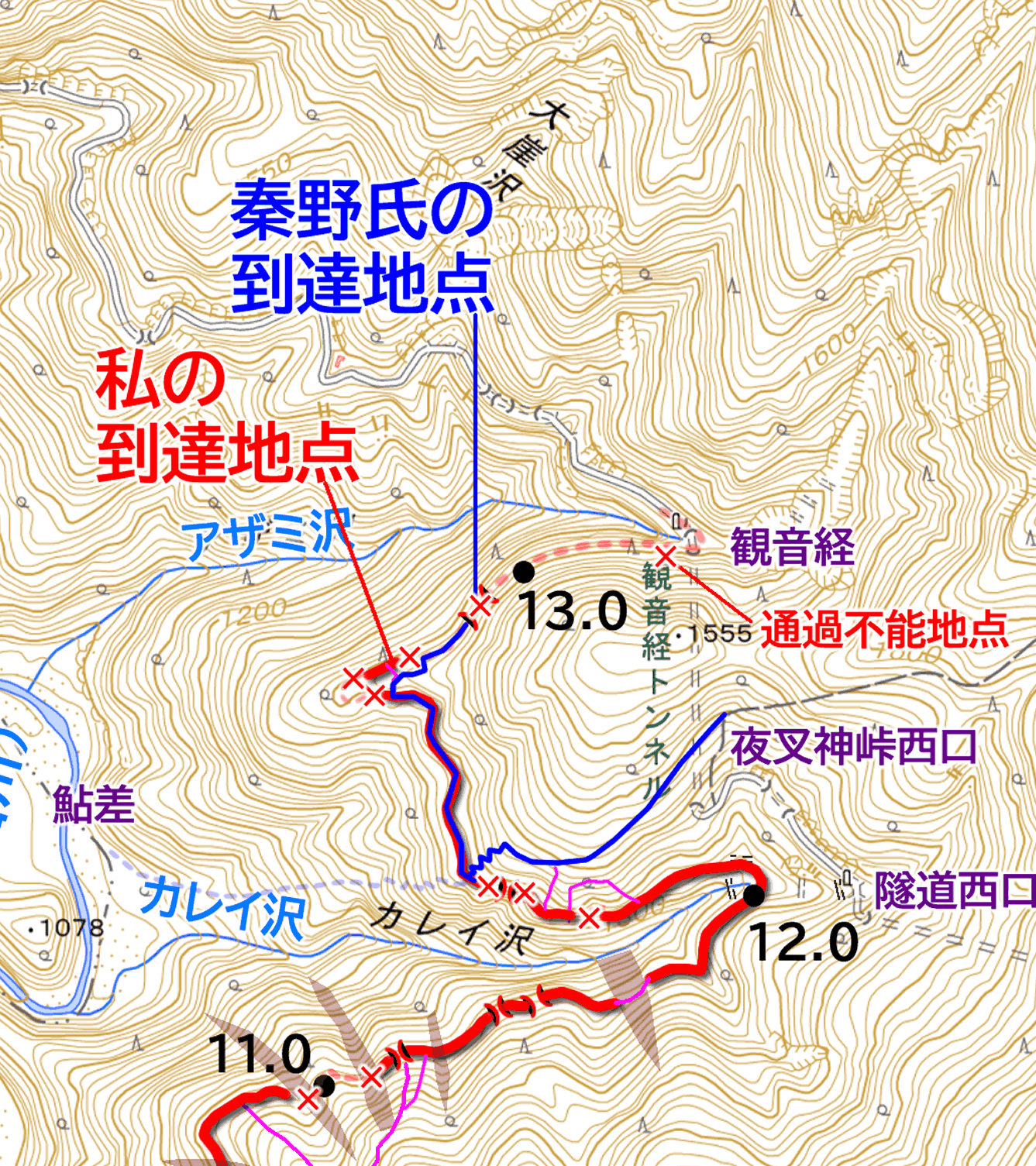 秦野氏のレポート及び、ご本人からの聞き取りによって推測された、平成17(2005)年11月23日の秦野ご夫妻の探索ルートは、左図に青線で示したようなものとなる。