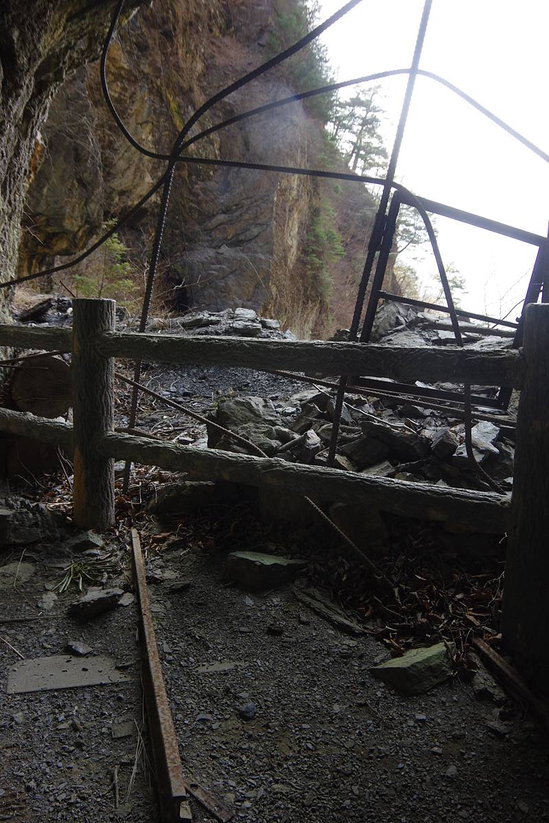 また、昨日今日を通じても初めて見る量の残雪の山が、小さな坑口を塞ぎそうになっていたが、これは高い岩壁に囲まれた日陰の谷底という立地が原因だろう。