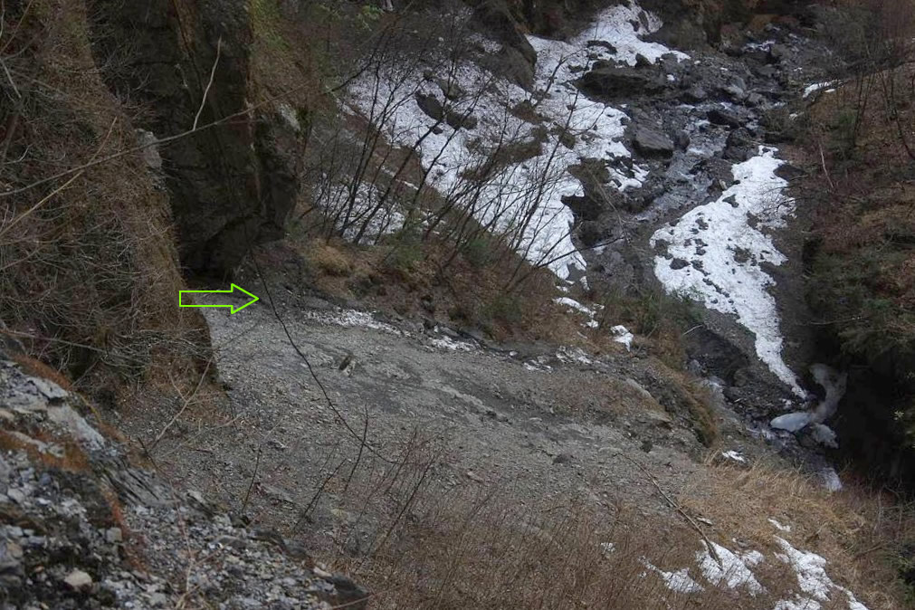 奥の1本だけ小さな針葉樹が生えている所まで行けば中間地点で、その向こう側はガレ場と、そして“隔絶のシュート”となっている。
