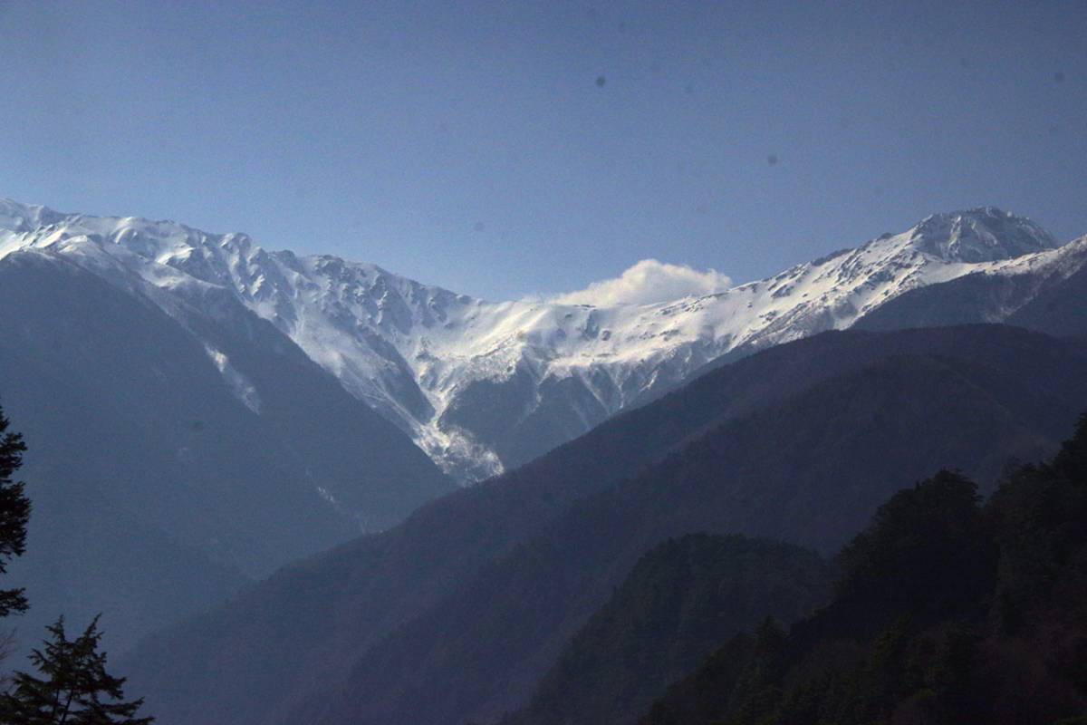 写真正面に見えるのが観音経隧道の北口であり、その右の残雪の山の後ろに小さく口を開けているのが林鉄の隧道である。