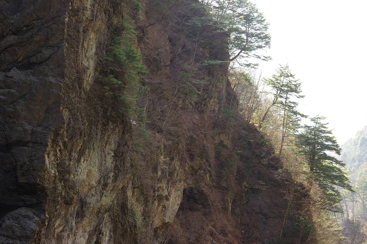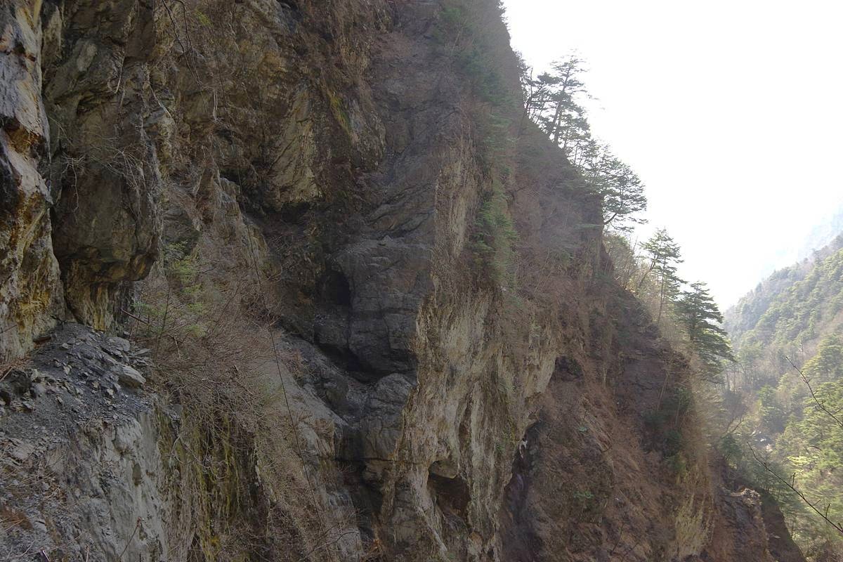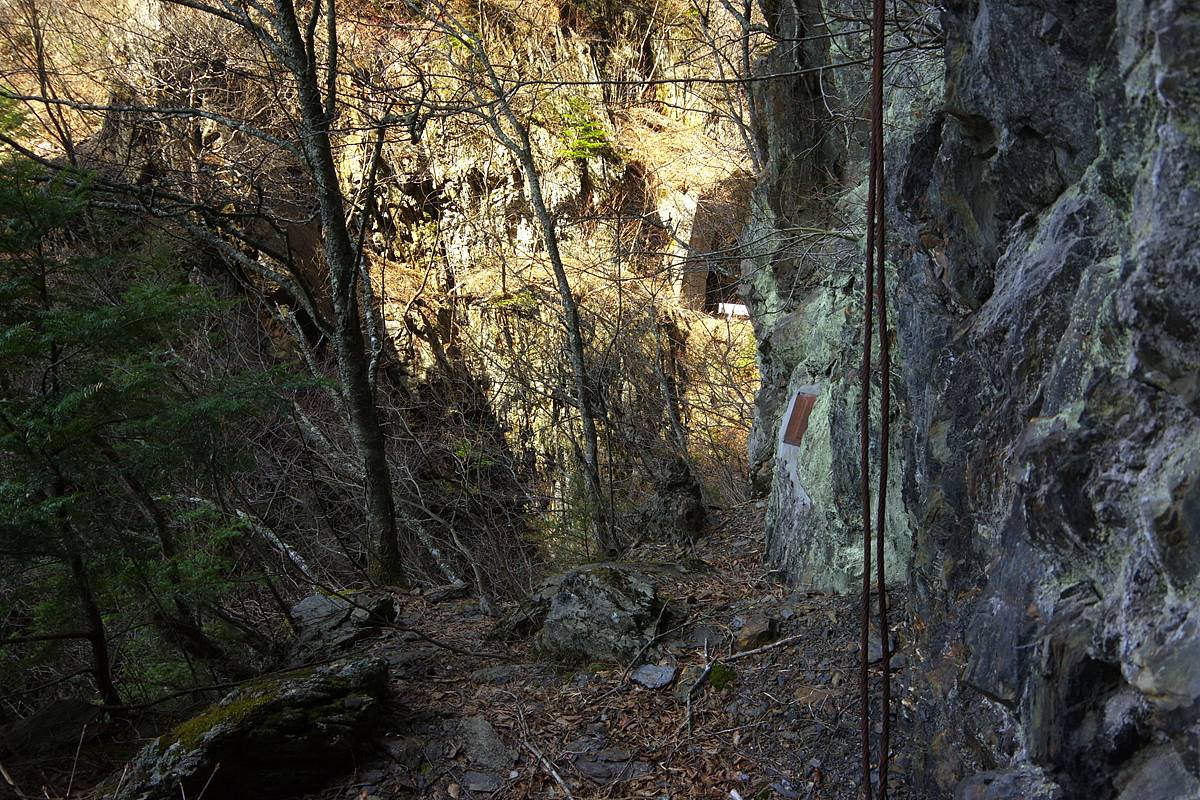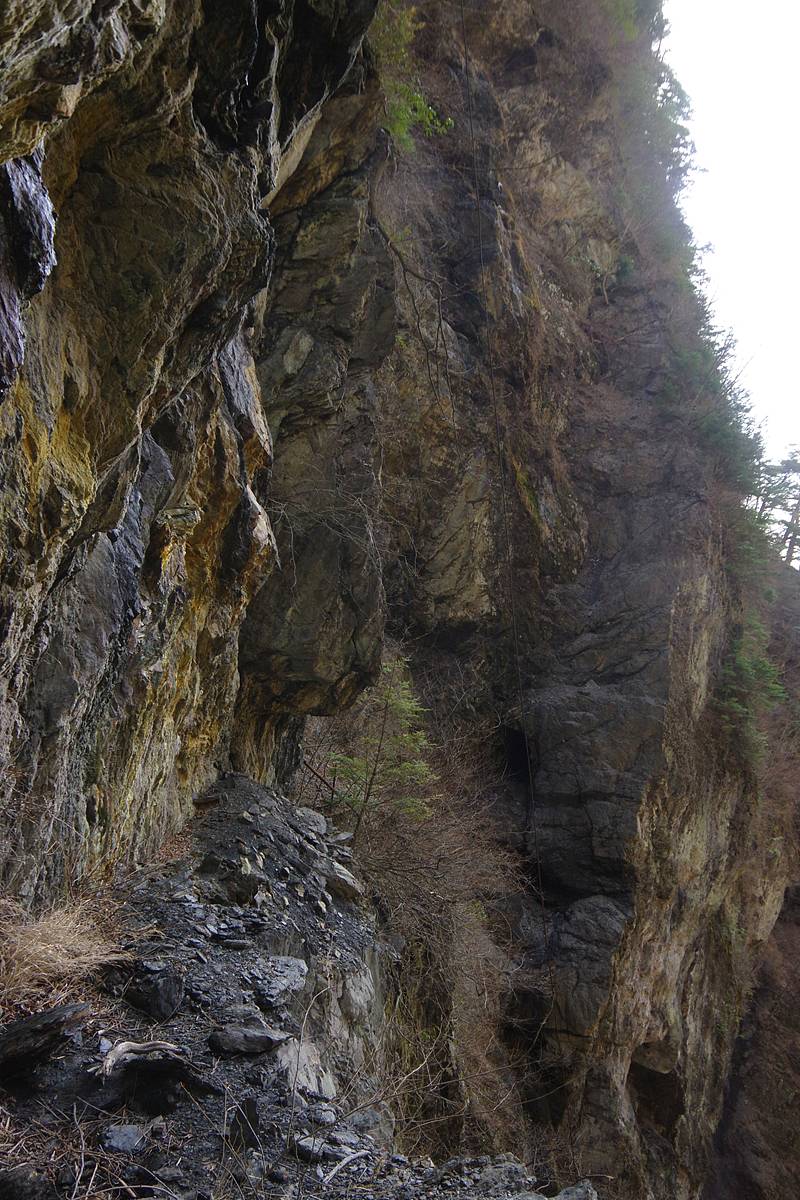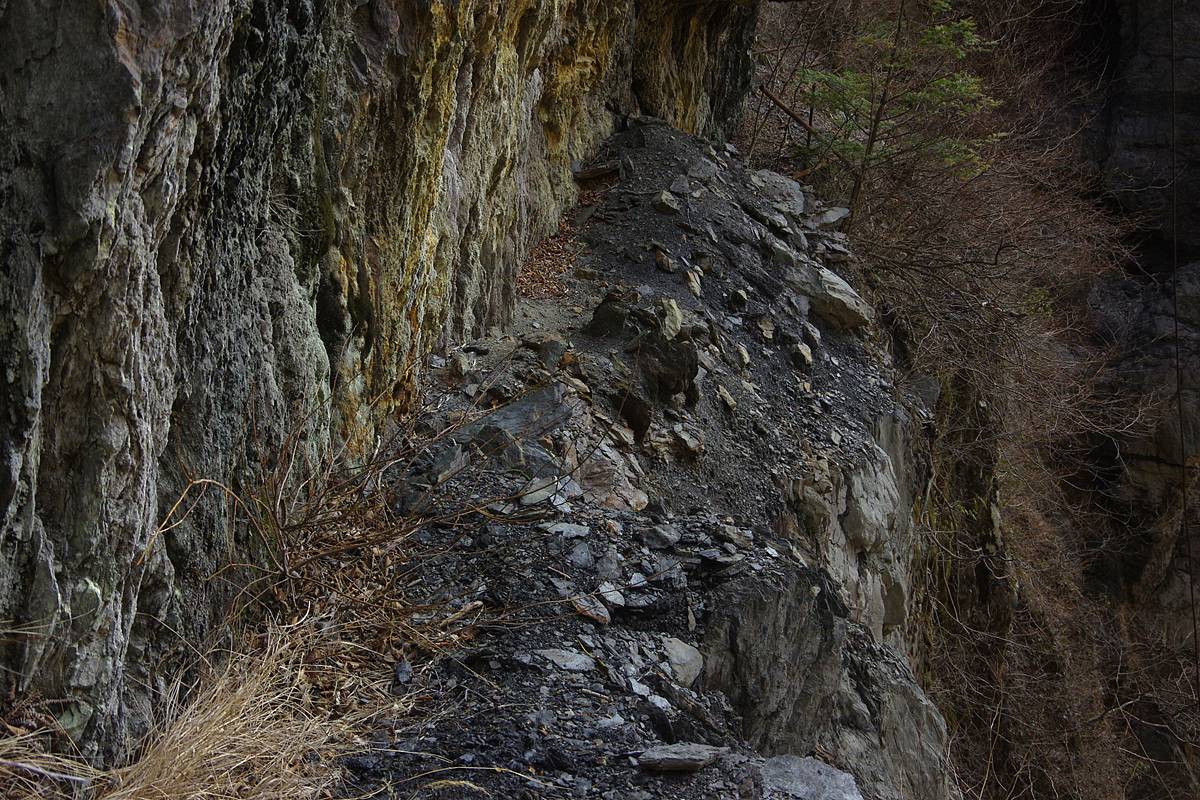 このうち手前側の半分ほどが崖をコの字型に切り開いた片洞門で、残りは切り立つガレ場と、切れ落ちたシュートからなっている。