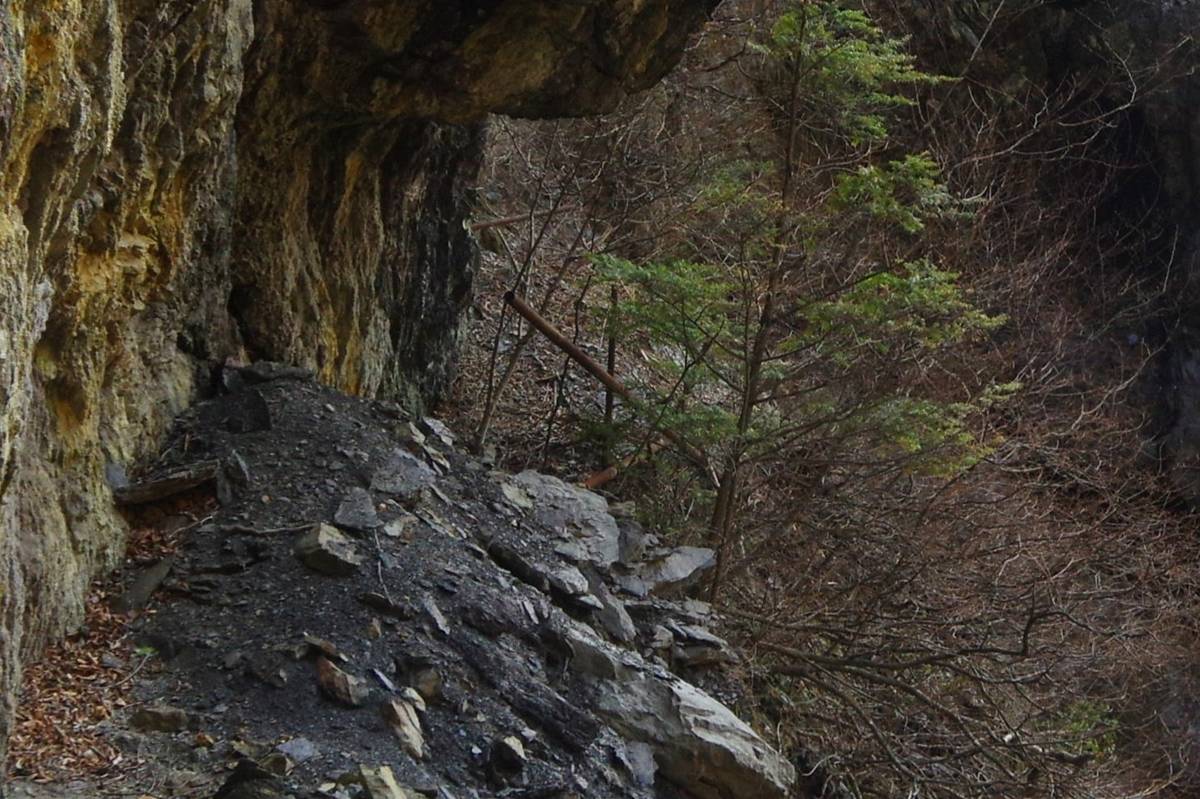 二つの隧道を隔てる約100mの距離は、部分的に垂直を越えてオーバーハングしている恐るべき崖壁のトラバースである。