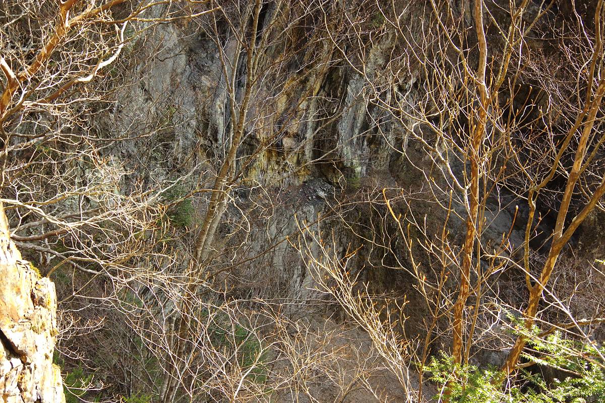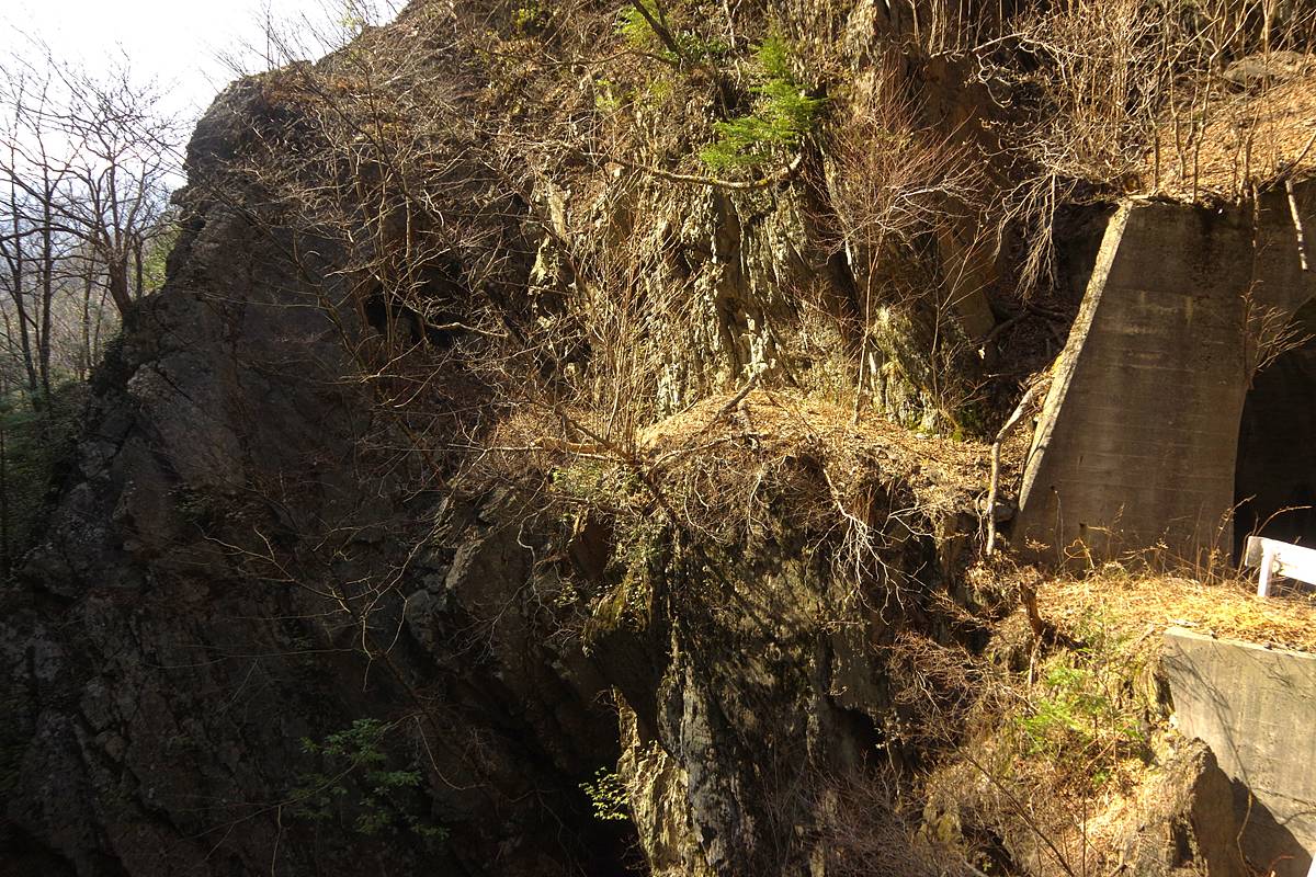 同地点から視線を右にずらすと、林道がトンネルで通過している岩場の崖壁をへつり越えようとする軌道跡を見ることができる。