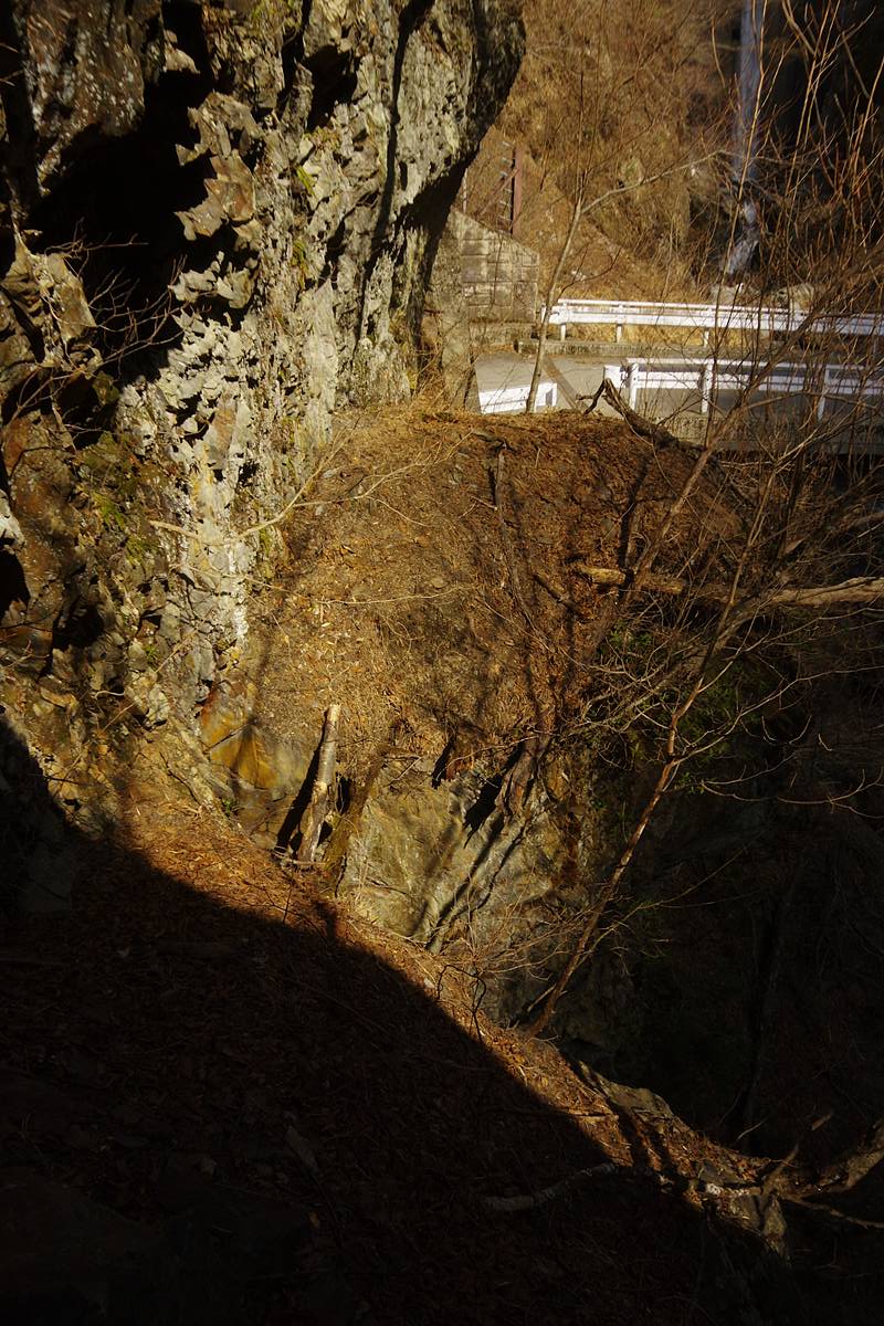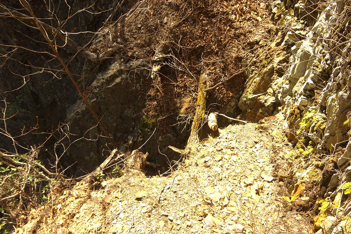 手前の低いところから奥の路盤へ登る際、狭い縁のどこかに体重を掛けねばならないのだが、いかにも脆そうであり、突然崩れたりしないかという怖さがあった。