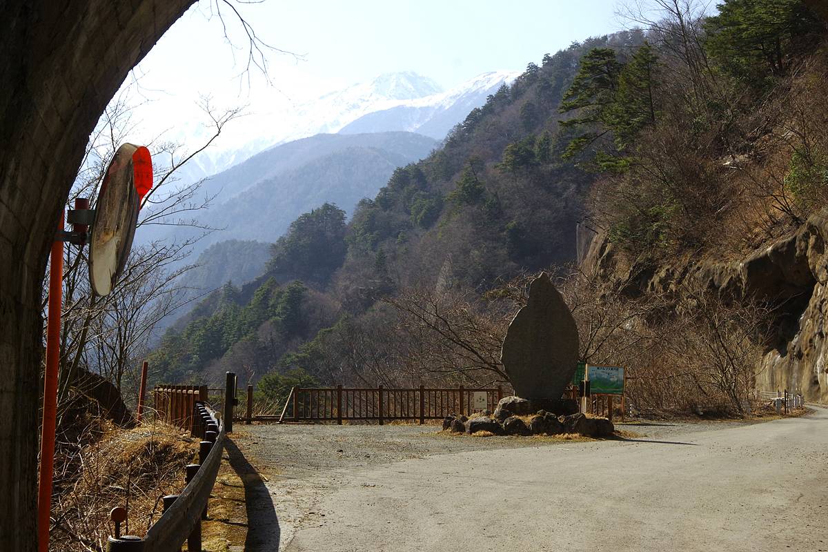 トンネルを出るとそこは広場になっており、野呂川の谷に開けた正面に白峰三山の白い頂を眺望する理想的な展望地となっていた。
