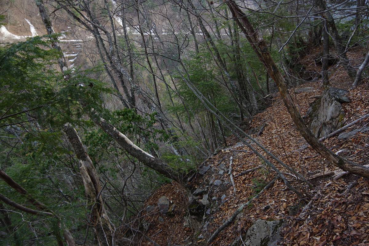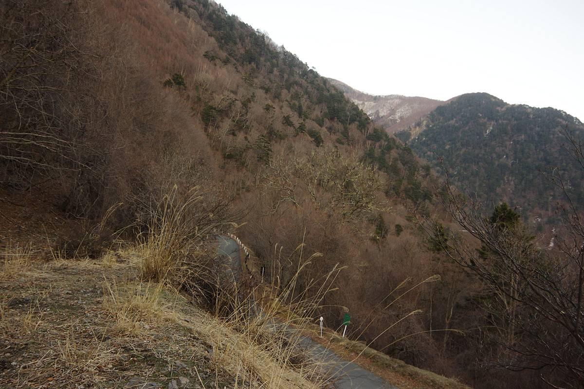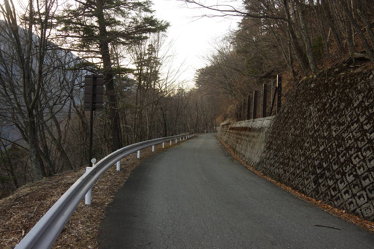 旧野呂川林道はこの辺りが最高標高であり、しばらく進めば広河原へ下り坂になる。そこまでいけば完全に軌道跡ではないと膚で感じることが出来るだろう。なお広河原まではまだ7kmくらいある。