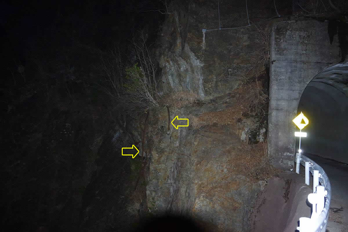 手持ちのライトに照らし出された、林道8号隧道脇のヤベー〜軌道跡。