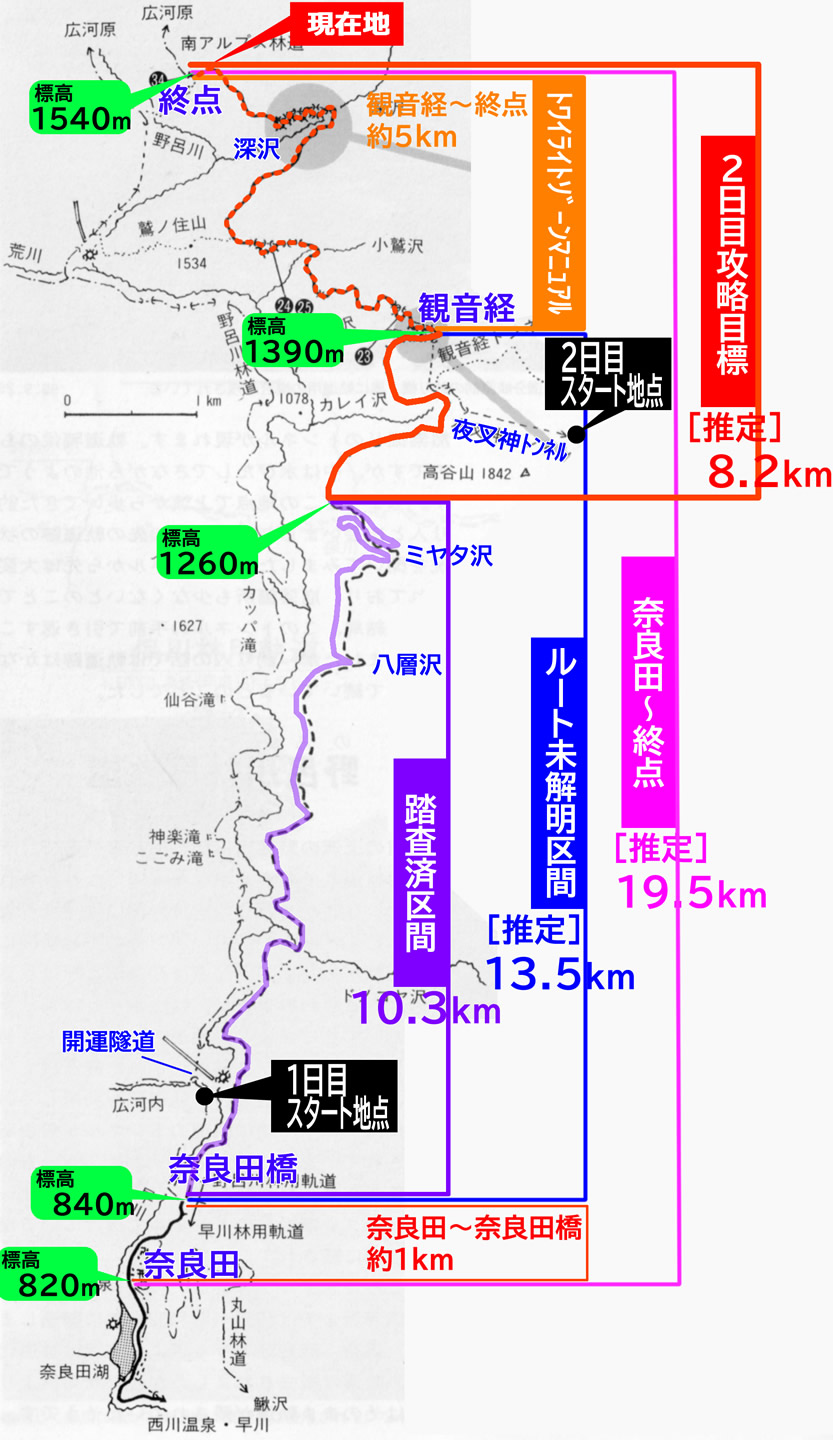 今しがた私の場所の日は落ちた。ここからは1日の探索時におけるロスタイム的な部分に入る。だがもちろんここまで来たからには、写真の写りや遺構発見に不利はついても、終点到達という目的達成までやるつもりだ。