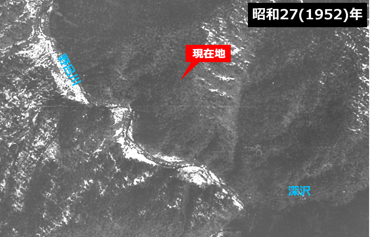 これは昭和27(1952)年と昭和45(1970)年にそれぞれ撮影された当地の航空写真の比較であるが、林鉄廃止から林道建設のまでの間に撮影された前者だと、一帯は鬱蒼とした山林ばかりで、軌道跡らしいラインも、終点の広大な敷地も、何も見えない。