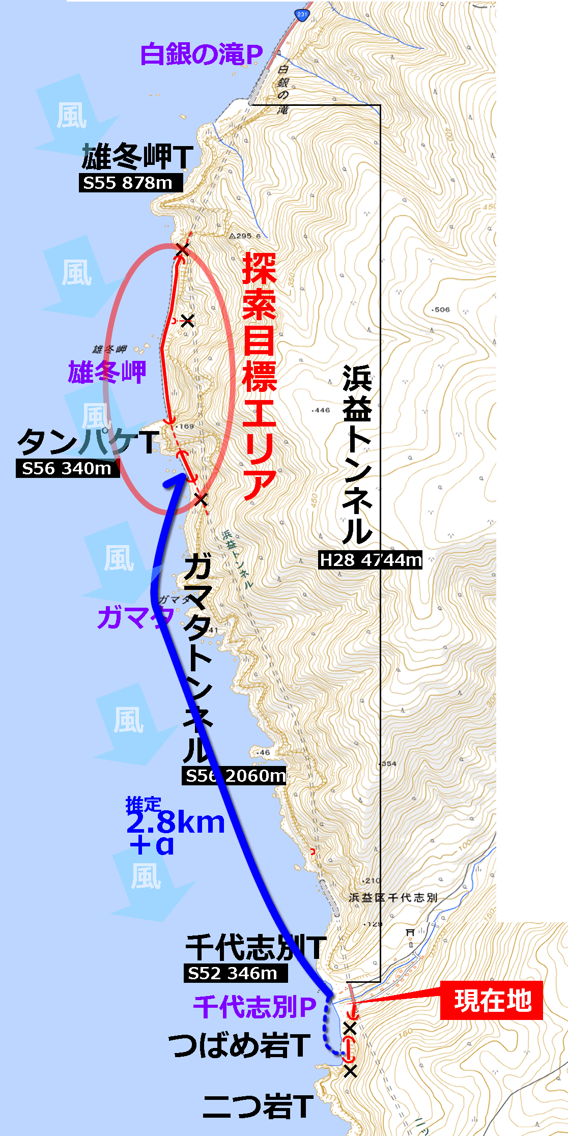 そして、もしこれが本当に横坑で、地上に繋がっているのであれば、前後のトンネルが封じられ、到達可能な陸路が失われた雄冬岬の旧道部へ容易く到達可能な、ウラワザ的進入口となる可能性があった!