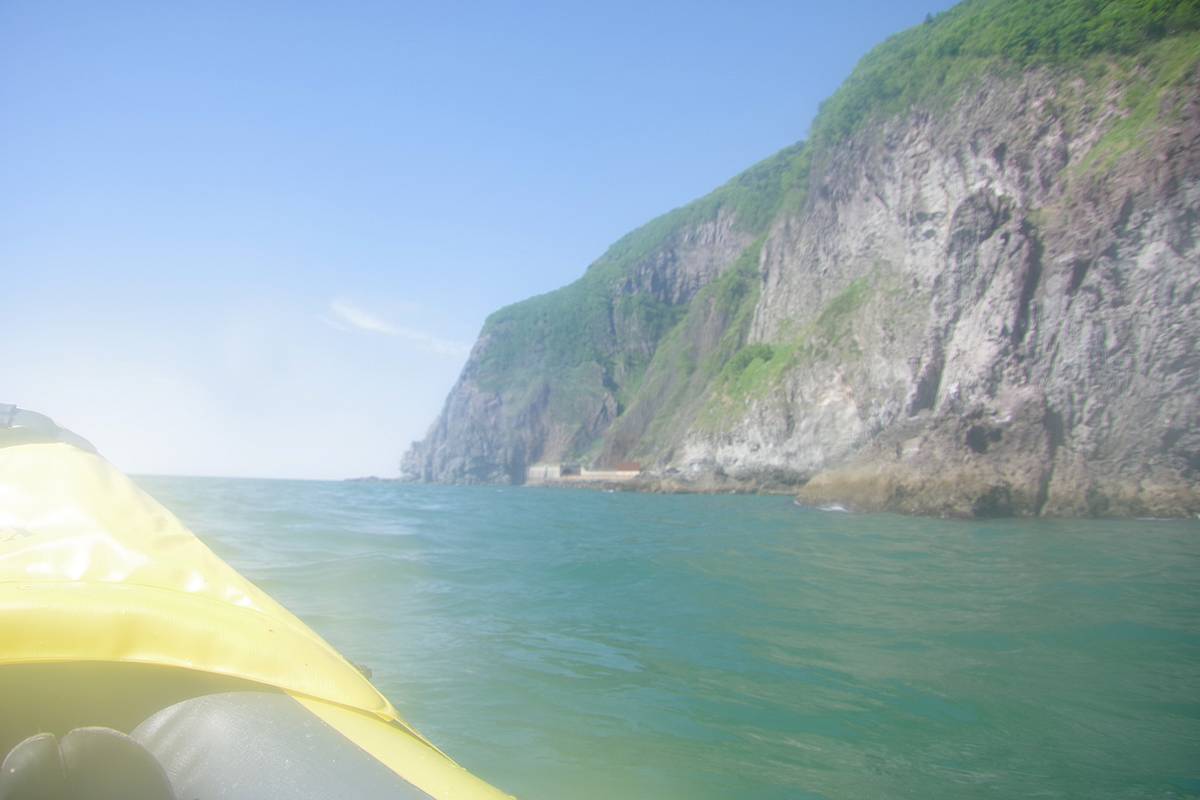 標高点のある岬を回り込む場面では、岸壁から20mくらいの至近距離を通過した。そこから岬を見上げて撮影したのがこの写真だ。