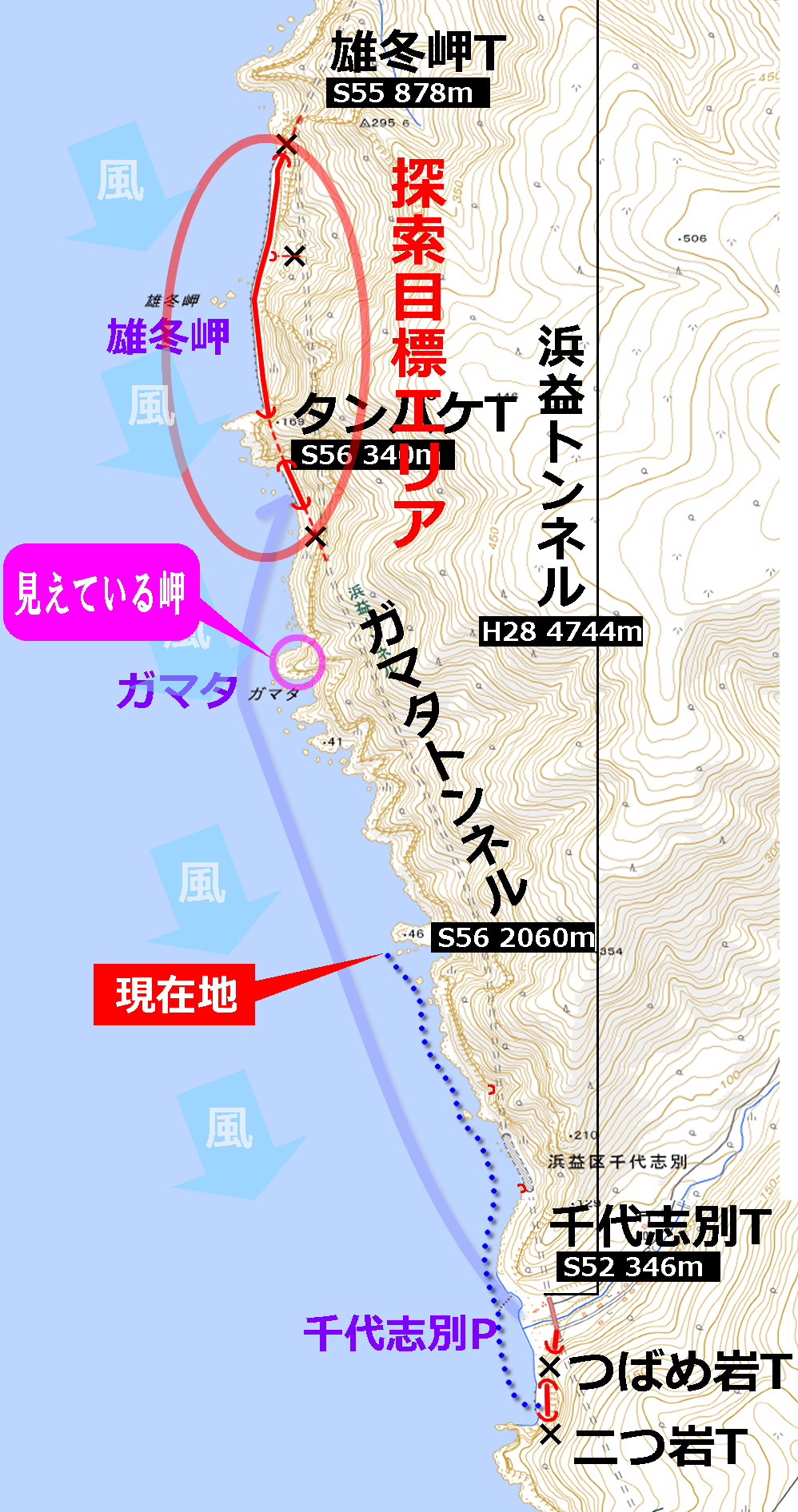 あと、地味にここで初めてガマタの岬よりも奥にある地形の一部が見えたのだが(赤線部分)、目指す旧道は、あの下の岸にあると思う。