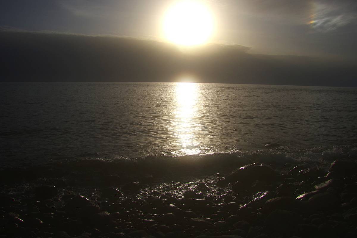 浜で一人、まだ慣れないカヤックの撤収作業に手こずっていると(膨らませるのは早いが、空気を抜いてしまうのは大変なんだよ)、夕陽となった太陽が、西の海上に厚く堆積した黒雲に沈む瞬間を目撃した。