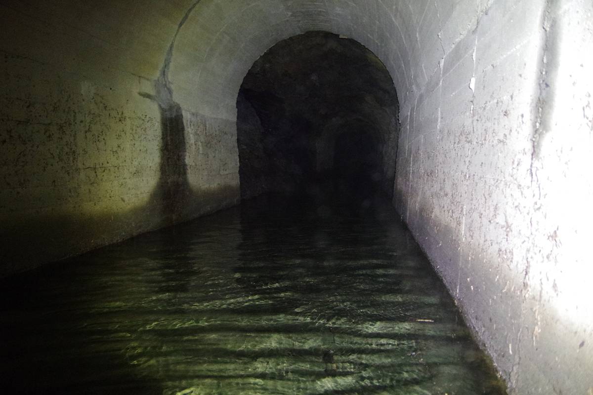 路面には濡れた泥が浅く堆積しているから、比較的最近も水没していたようだ。隧道内の水位には、かなり大きくかつ早い変動があるらしい。