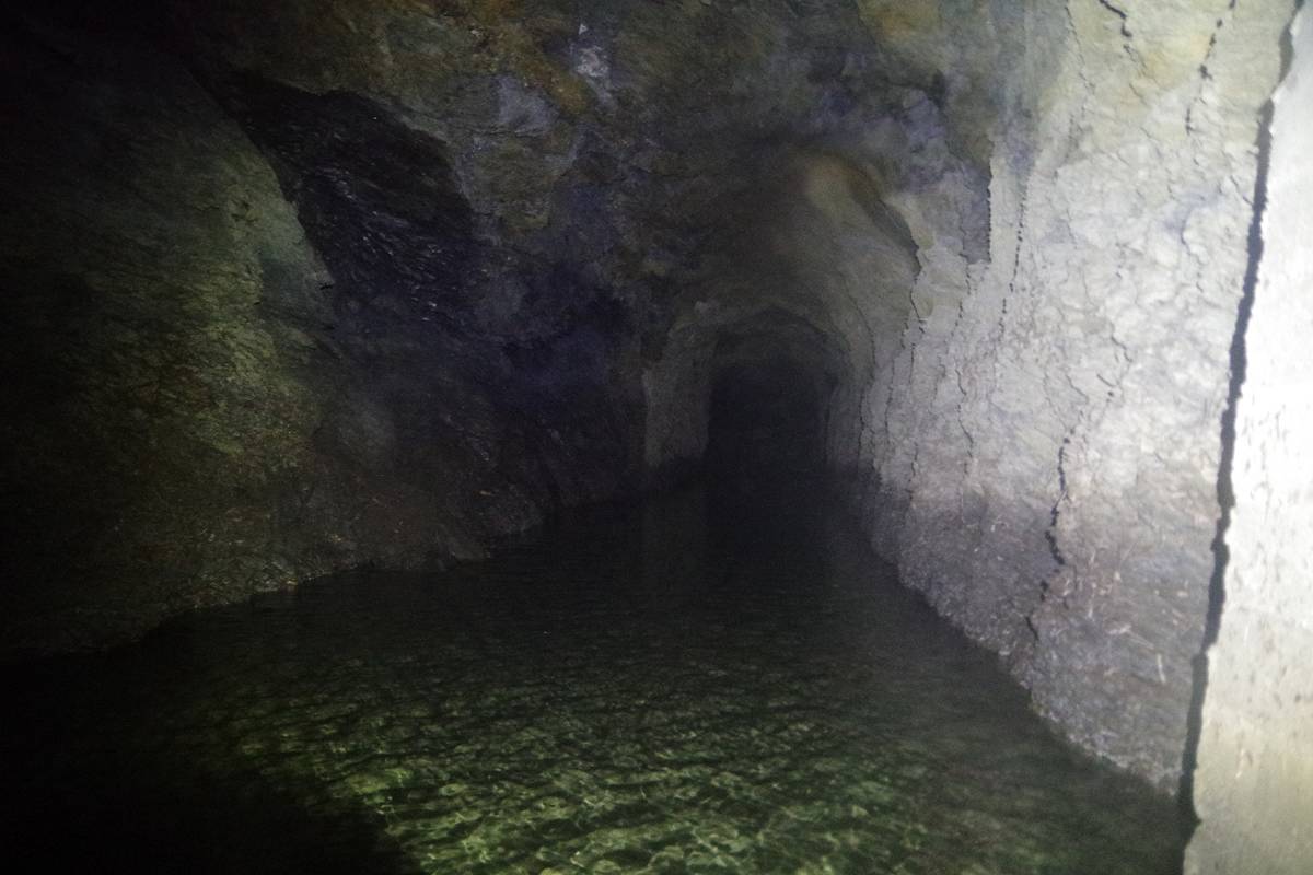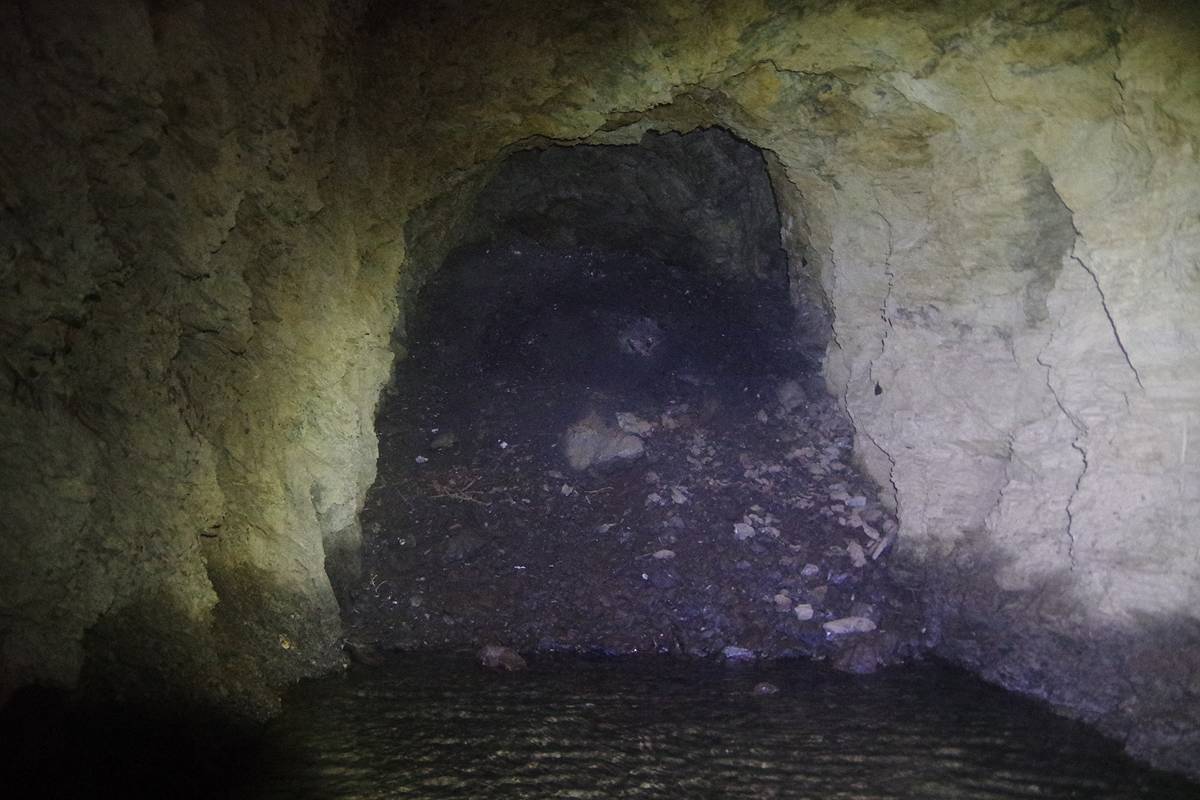 坑口に土砂が高く積もっていて、排水もされている様子がないことから、覚悟しなければならないとは内心思っていたが、入ってすぐに水没か……。