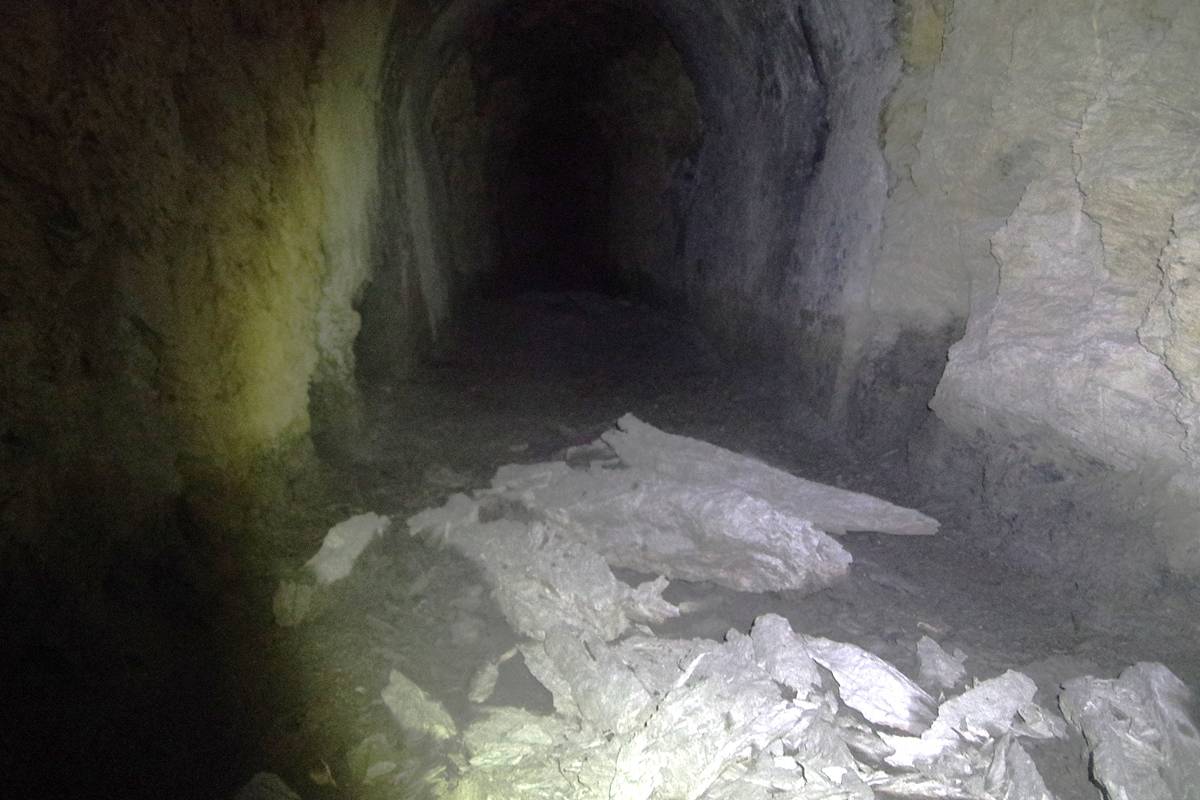 天井に巻き立てがない部分があるが、剥がれて落ちたのかもしれない。洞床に小さなコンクリート片が大量に散らばっていた。