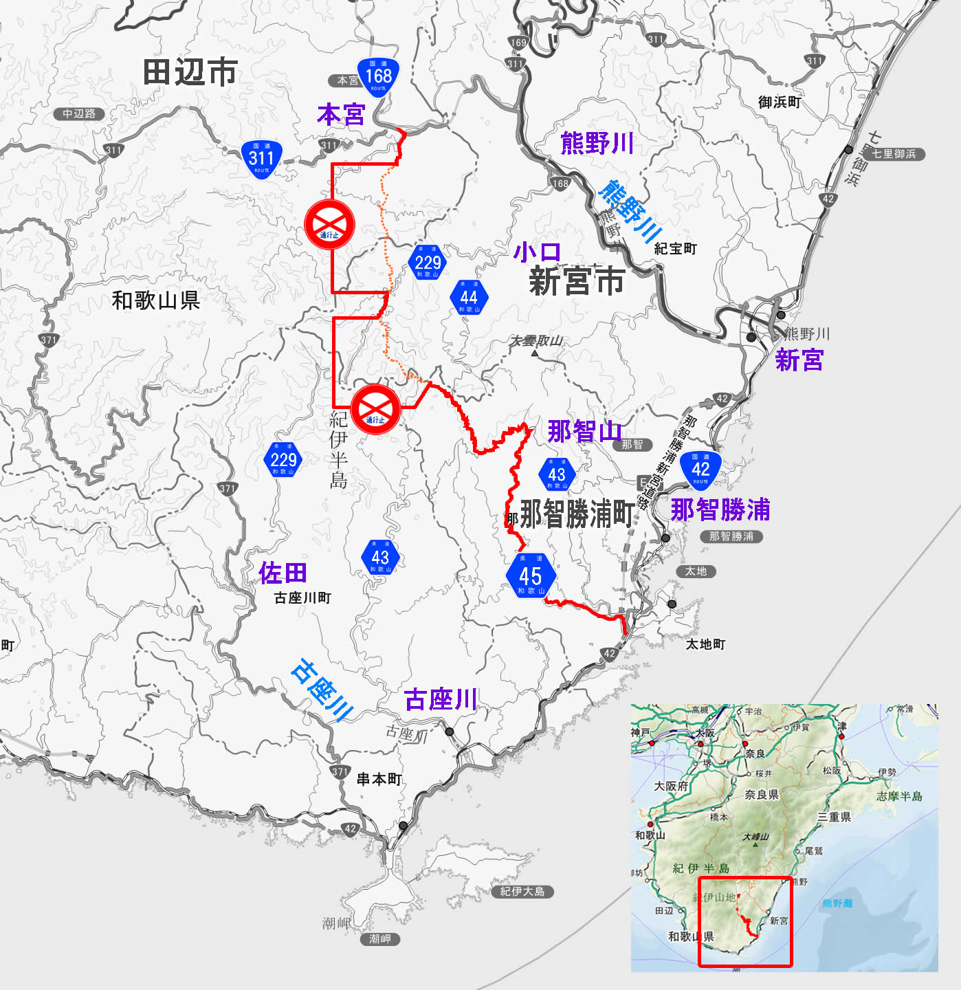 路線名は、和歌山県道45号那智勝浦本宮線。主要地方道である。