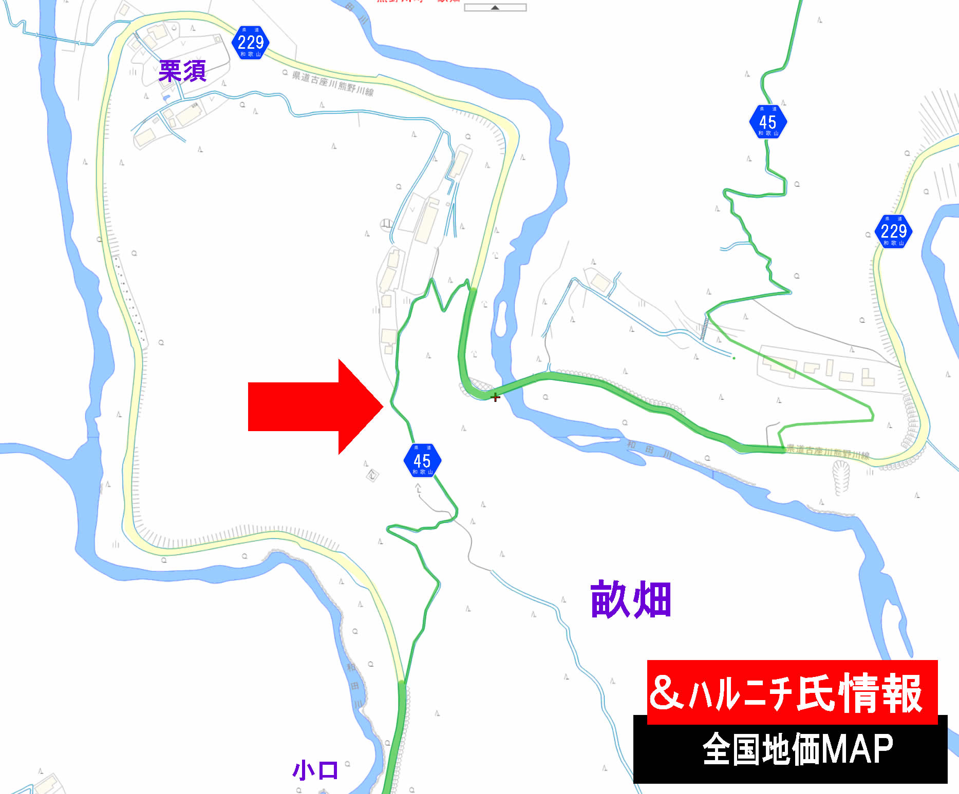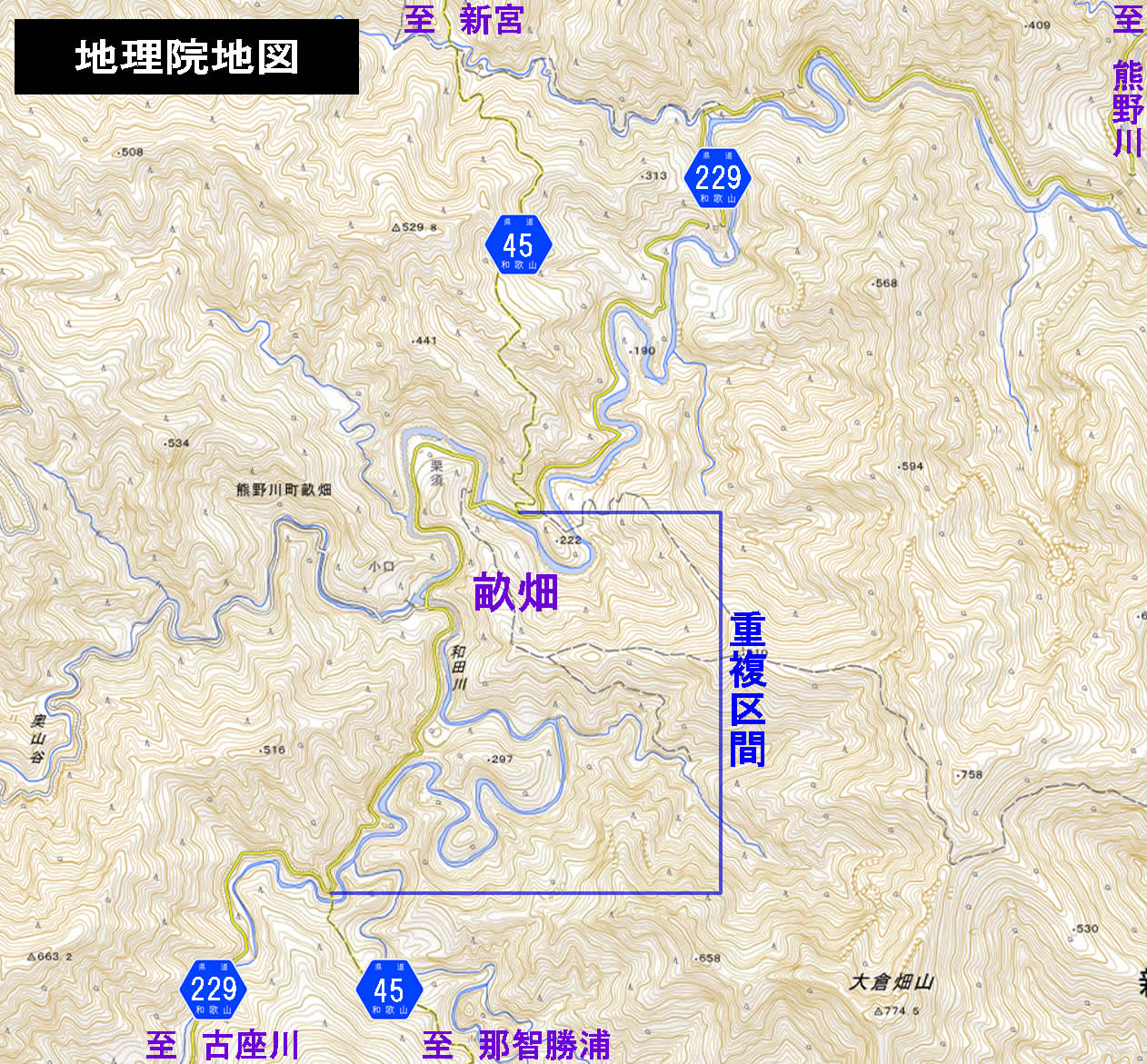 で、この地理院地図をよく見ると分かるが、畝畑集落の前後1〜2kmの短い区間のみ、前出の県道229号と今回の本題である県道45号が重複している……ように地形図だと描かれている。