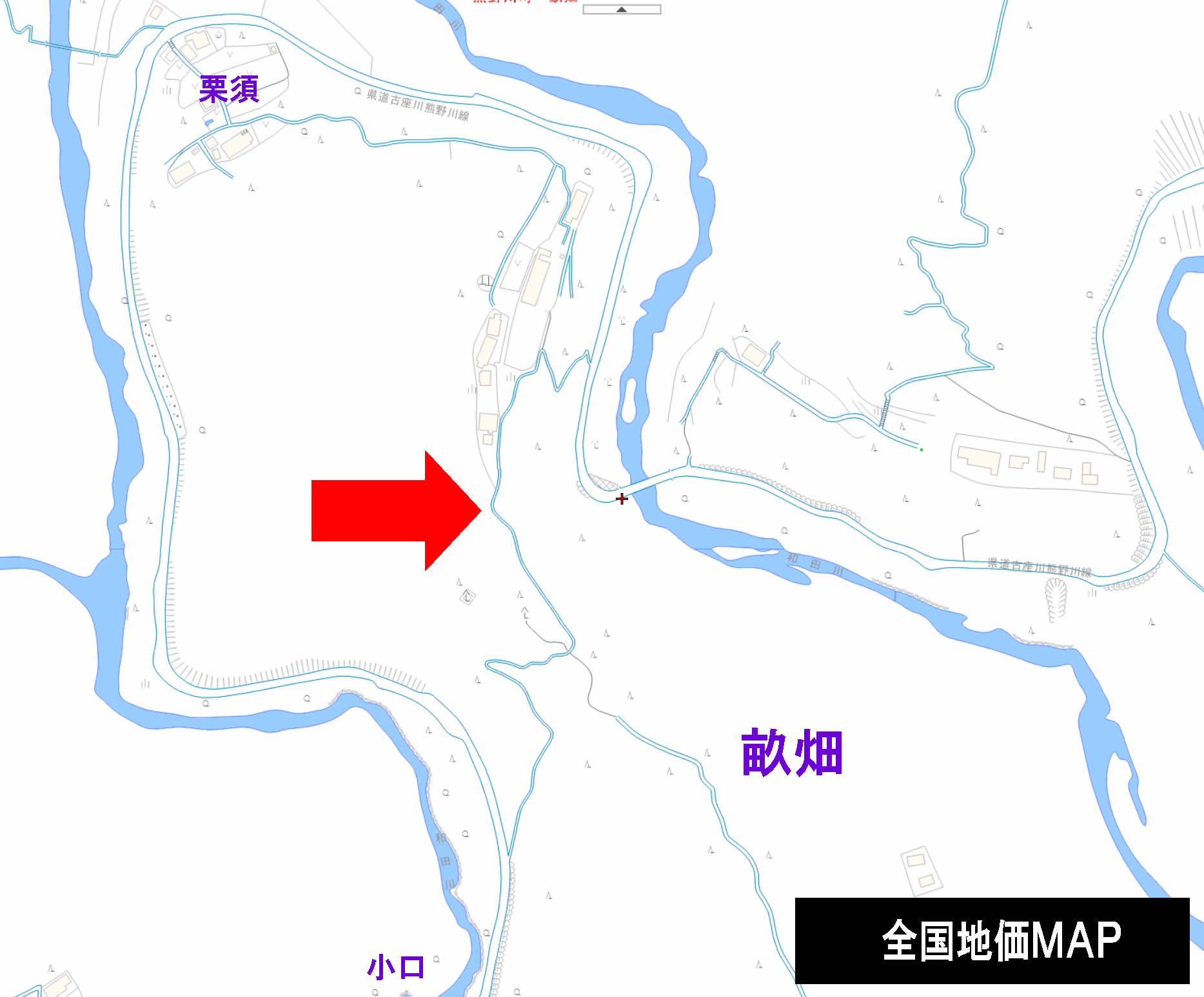 全国地価MAPで見ることができる大縮尺の詳細な地図だと、“矢印の位置”に、地理院地図には描かれていなかった、短い峠越えの道がある。