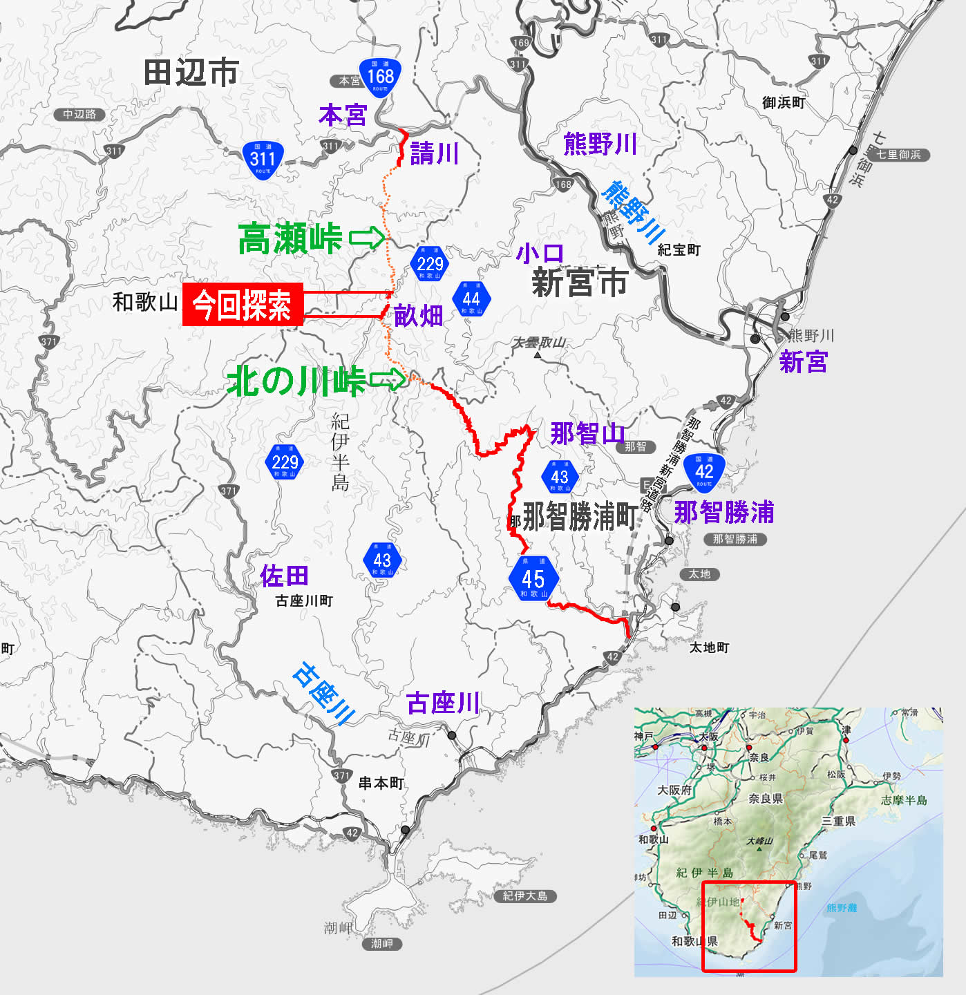 チェンジ前の画像に赤線で示したのが府県道那智本宮線で、チェンジ後の現在の道路網に赤線で示したのは県道45号那智勝浦本宮線である。