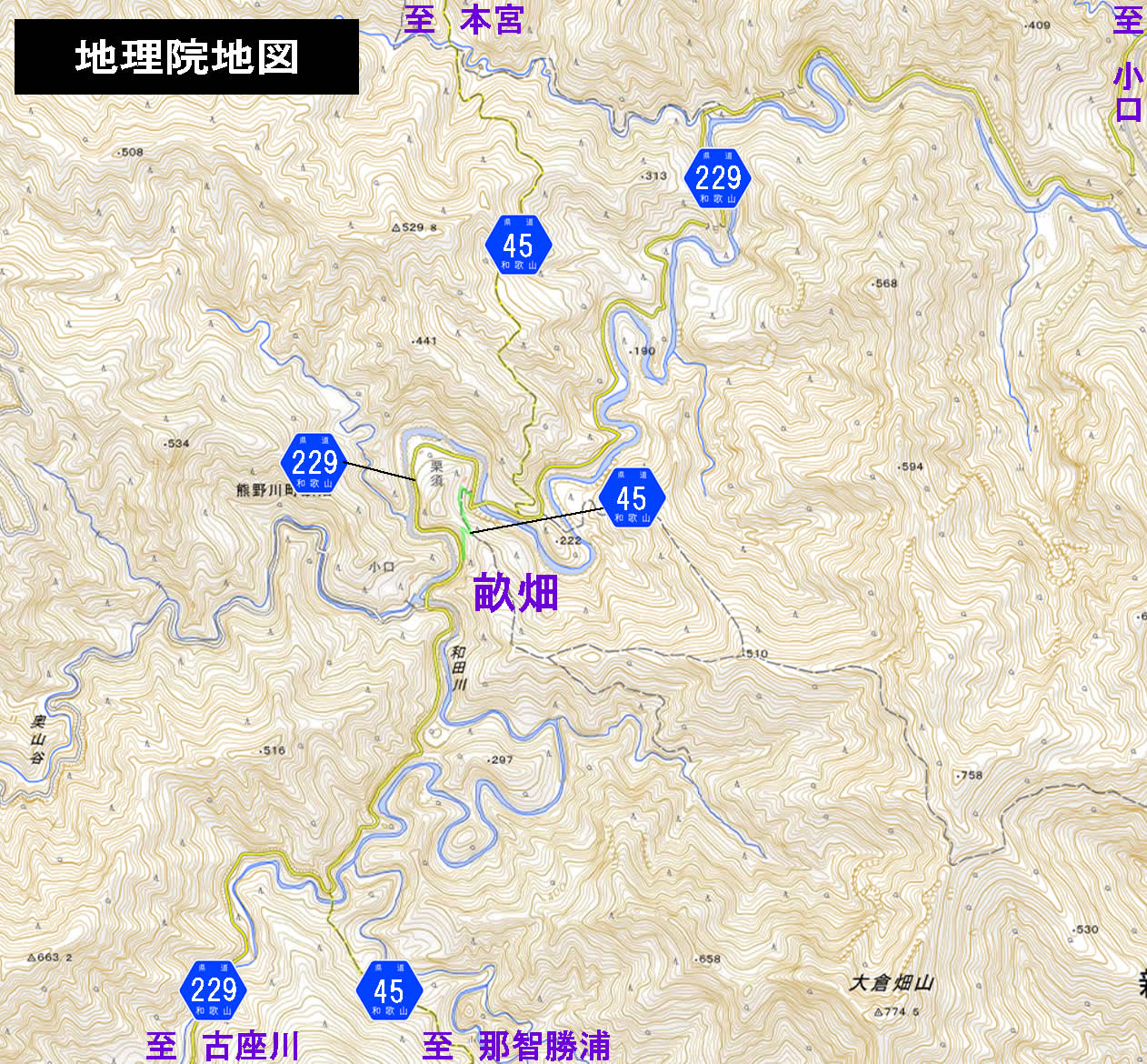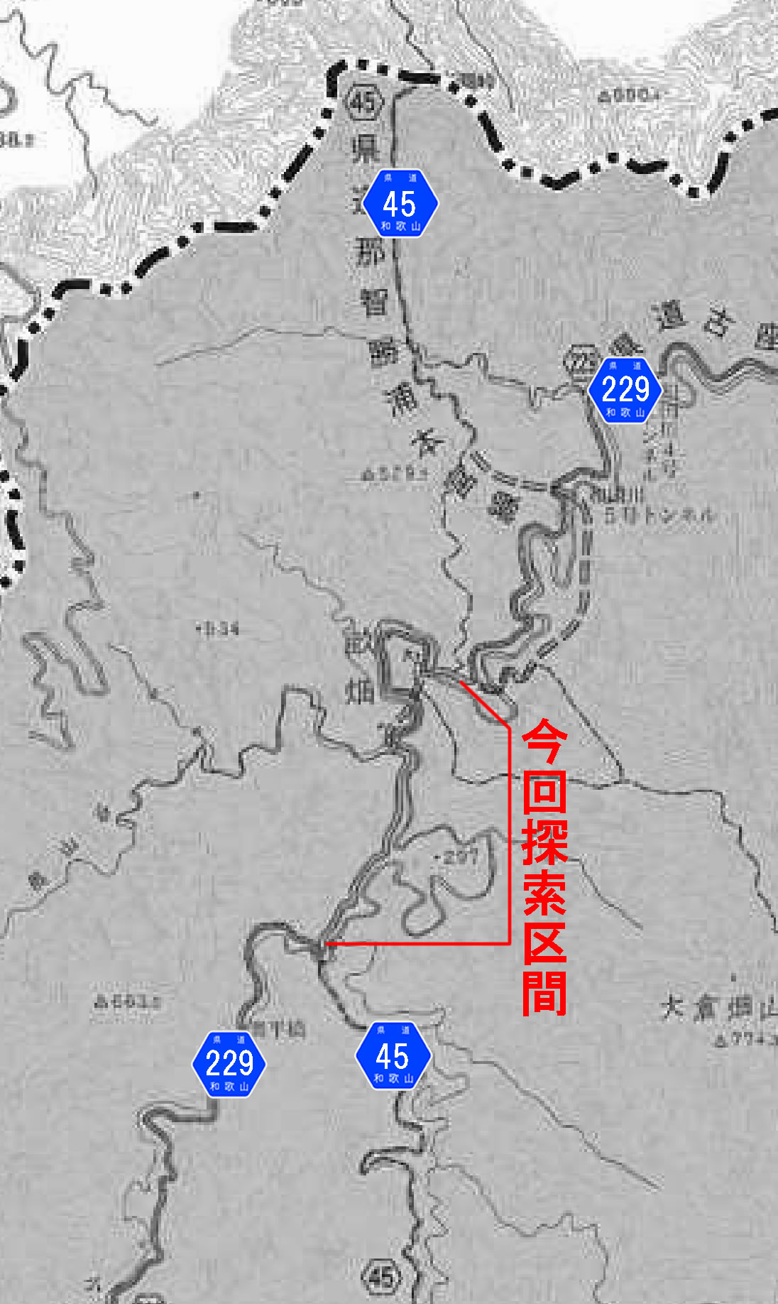 どういうわけか歴代地形図だと毎回、この府県道は畝畑周辺で里道や町村道として表現され、県道として描かれなかったので気付きづらいのだが、この大正9年認定の府県道那智本宮線こそ、現在の県道45号の原点である。