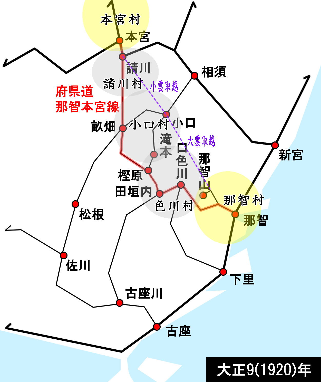 また、前年の大正8年版の統計にはこの路線はないので、(旧)道路法による府県道の認定が行われた大正9年に初めて認定された路線であると見て良いだろう。