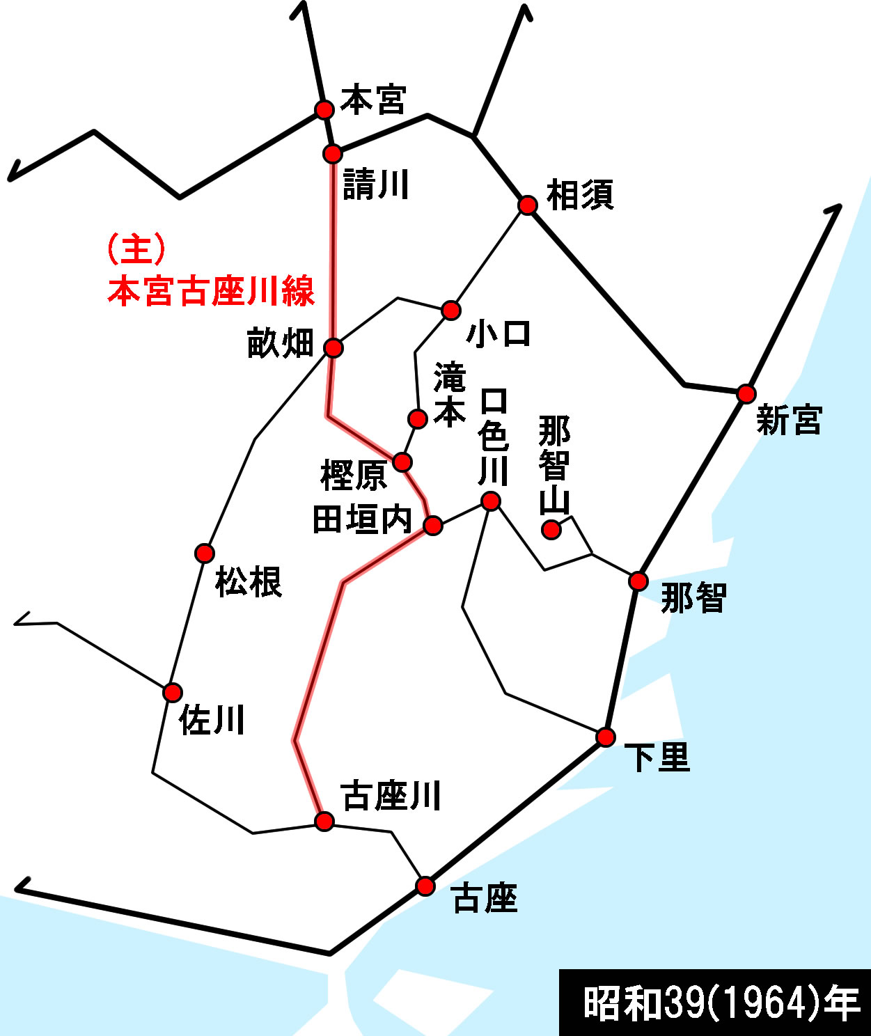 本宮古座川線の経路は右図に示したとおりで、起点が本宮側になっていて、そこから請川〜畝畑〜樫原〜田垣内までは従来と同じだが、その先は古座川へ南下する(現在の県道43号の区間)ルートを採って、那智山の西側山域を南北に縦貫する道路となった。